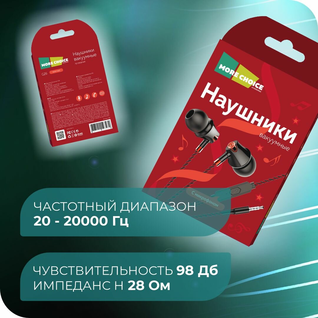 Наушники MORE CHOICE G26 проводные, вакуумные, 1,1м, черный/красный