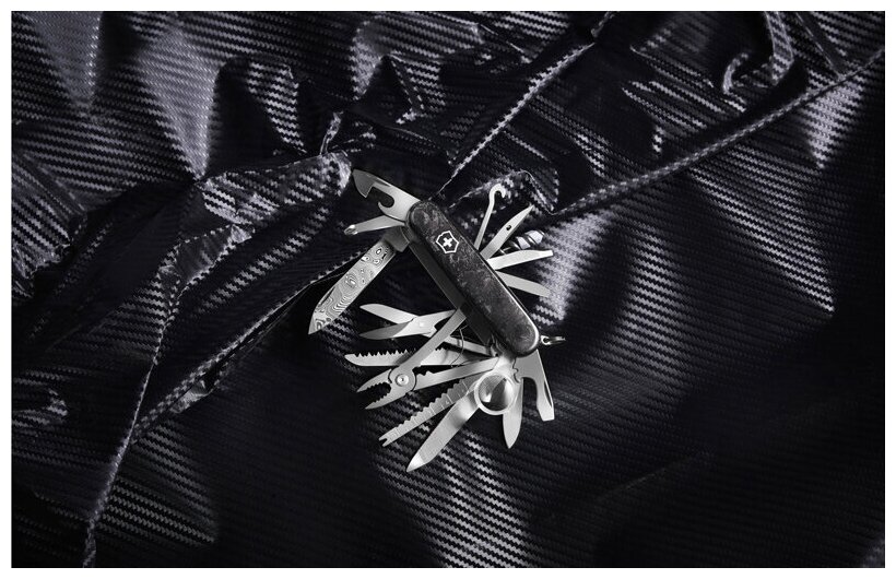 Лучшие цены. Victorinox SwissChamp Damast — Складной коллекционный нож лимитированной версии с клинком из дамасской стали. Это шедевр технологии, мастерства и современного дизайна. Многофункциональный нож выглядит как настоящий предмет искусства, а его уверенный стиль привлекает внимание каждого. Основное лезвие ножа выполнено из дамасской стали, которая обрабатывается особым и тщательным образом, создавая уникальные узоры «Bjorkmans Twist». Накладки рукояти изготовлены из "кованого" карбона. Магазины в вашем городе.