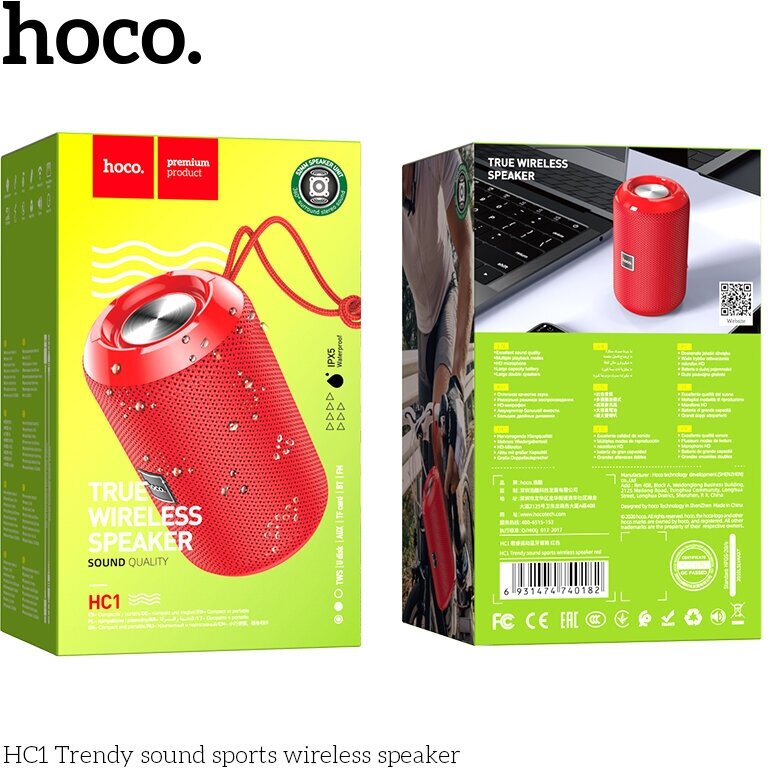 Bluetooth колонка HOCO HC1 Trendy BT5.0, 5W, AUX/TWS/FM/microSD/USB, IPX5 (красный)