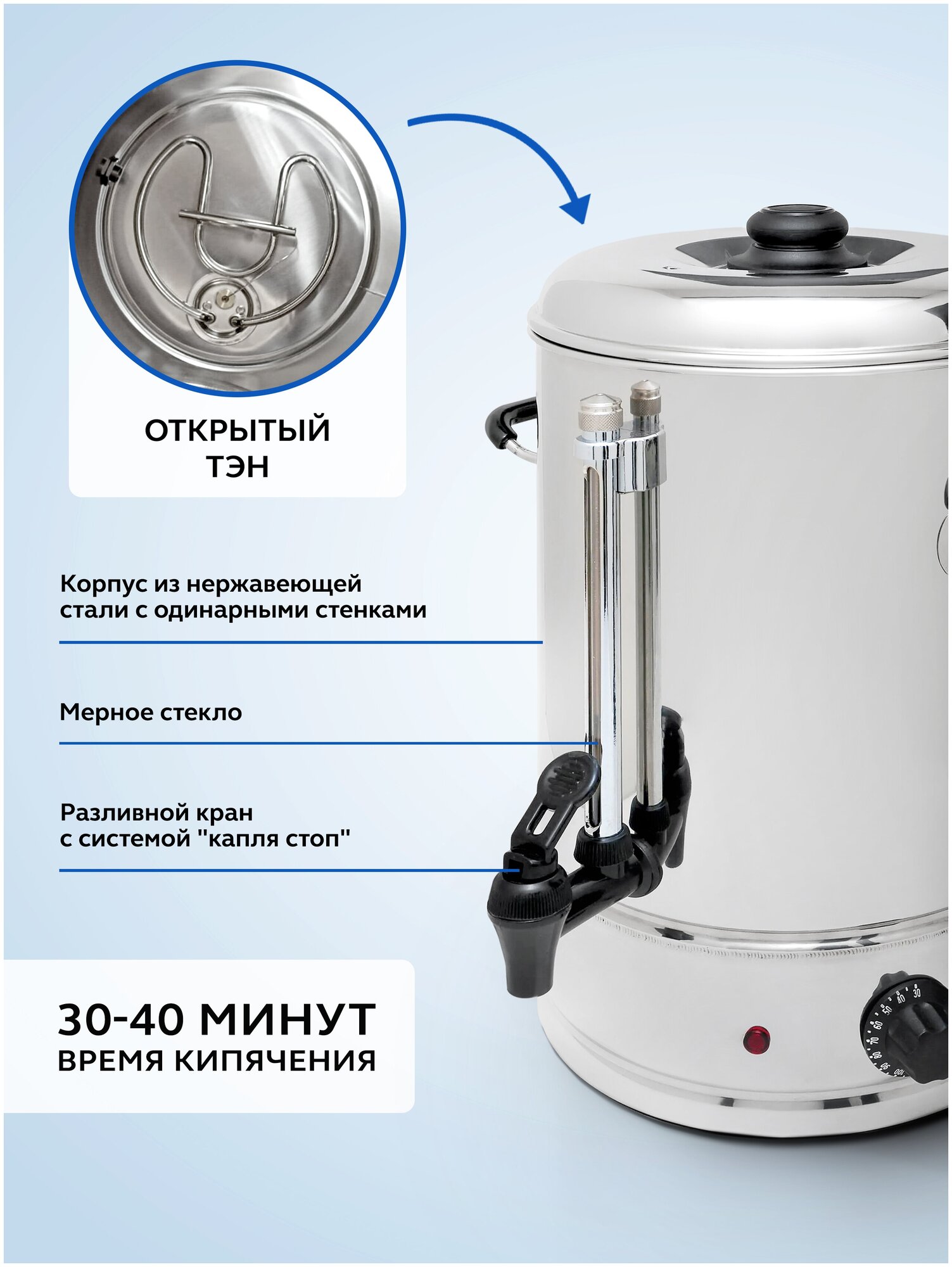 Лучшие цены. Кипятильник электрический большой Gastrorag DK-WB-10 - это техника для профессиональной кухни наливного типа. Он не требует подключения к водопроводу и обеспечит вас горячей водой повсюду, где есть электрические розетки 220 В. Кипятильник имеет объем 10 л и идеально подойдет для большой семьи, для приготовления напитков в небольших кафе, офисах и т. п. Время кипячения составляет 30-40 минут в зависимости от начальной температуры воды. Магазины в вашем городе.