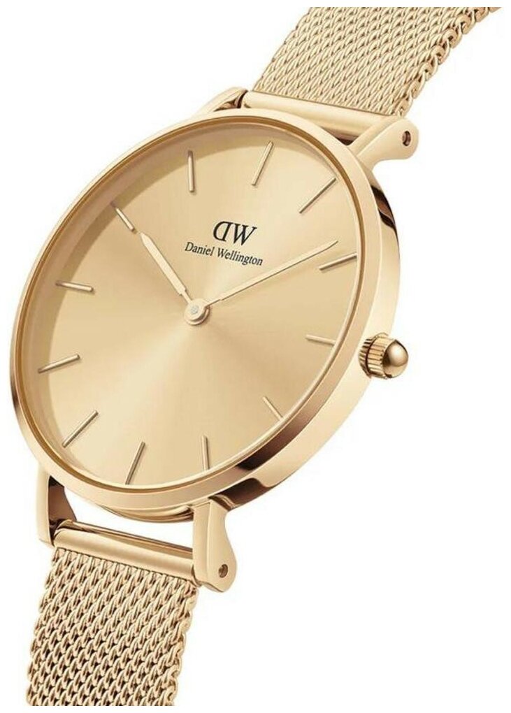 Лучшие цены. Женские кварцевые часы. Центральные часовая и минутная стрелки. Золотистый циферблат. Круглый корпус выполнен из нержавеющей стали 316L с IP покрытием цвета желтого золота. Диаметр корпуса составляет 32 мм, толщина 6 мм. Стальной браслет с покрытием шириной 14 мм выполнен в технике миланского плетения, длина браслета 150-205 мм, раскладная застежка. Прочное минеральное стекло устойчивое к мелким механическим повреждениям. Водостойкость WR 30 (брызги). Магазины в вашем городе.