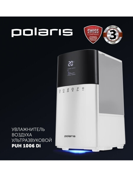Лучшие цены. Увлажнитель воздуха Polaris PUH 1006Di white:ультразвуковой обслуживаемая площадь 60 кв.м производительность 450 мл/ч объем резервуара для воды 6 л ионизация воздуха, ароматизация регулировка скорости работы мощность 30 Вт управление с пульта, таймер. Магазины в вашем городе.