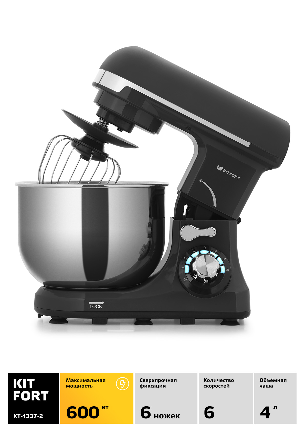 Миксер Kitfort KT-1337-2, планетарный, 600 Вт, 4 л, 3 насадки, 6 скоростей, импульс, чёрный
