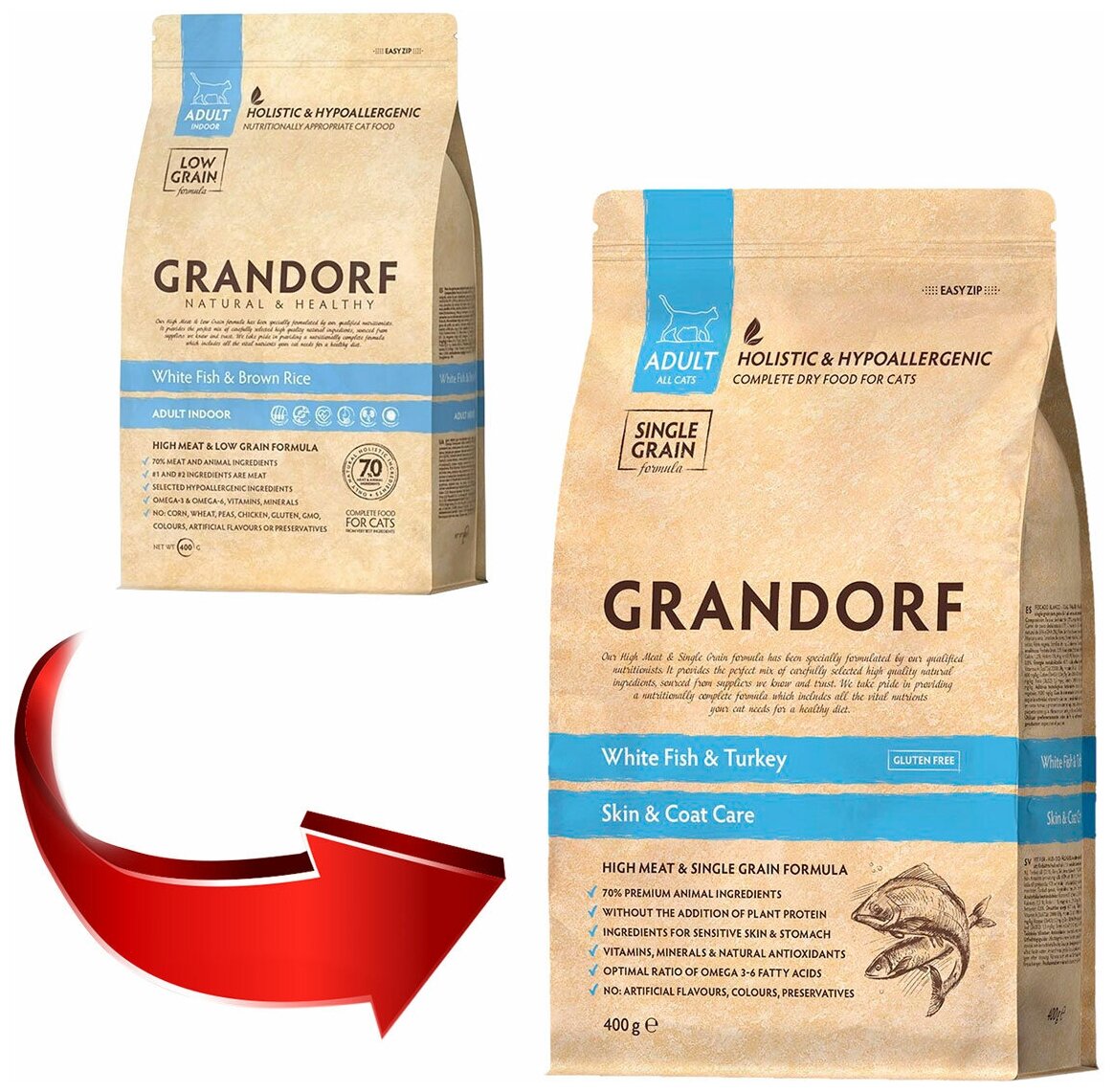 GRANDORF SINGLE GRAIN CAT ADULT SKIN & COAT CARE WHITE FISH & TURKEY низкозерновой для взрослых кошек с чувствительной кожей и шерстью с белой рыбой и индейкой (0,4 кг)