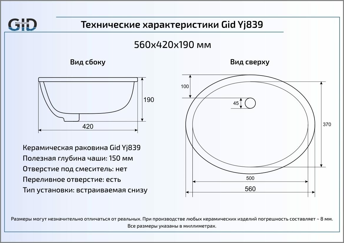 Раковина для ванной Gid Yj839 56x42x19см встраиваемая снизу