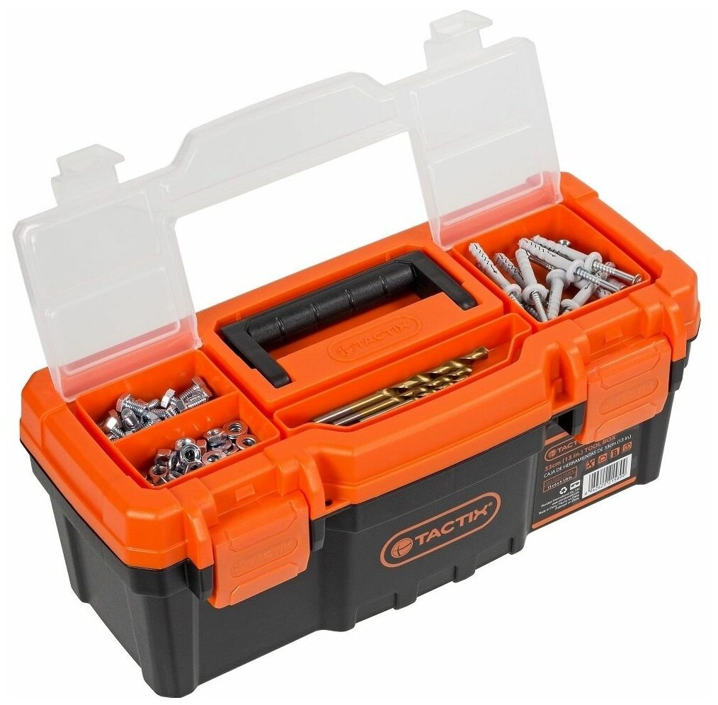 Лучшие цены. Ящик для инструмента Tactix 19" с оранжевой крышкой для хранения и перевозки инструментов и аксессуаров к ним. Встроенные органайзеры в крышке ящика для мелкого инструмента и расходных материалов; Подходит как для профессионального использования, так и для домашнего при хранении ручного инструмента и расходных материалов; В переносном лотке можно хранить любой мелкий инструмент и его можно использовать отдельно при небольшом ремонте как органайзер под расходные материалы и мелкий ручной инструмент. Магазины в вашем городе.