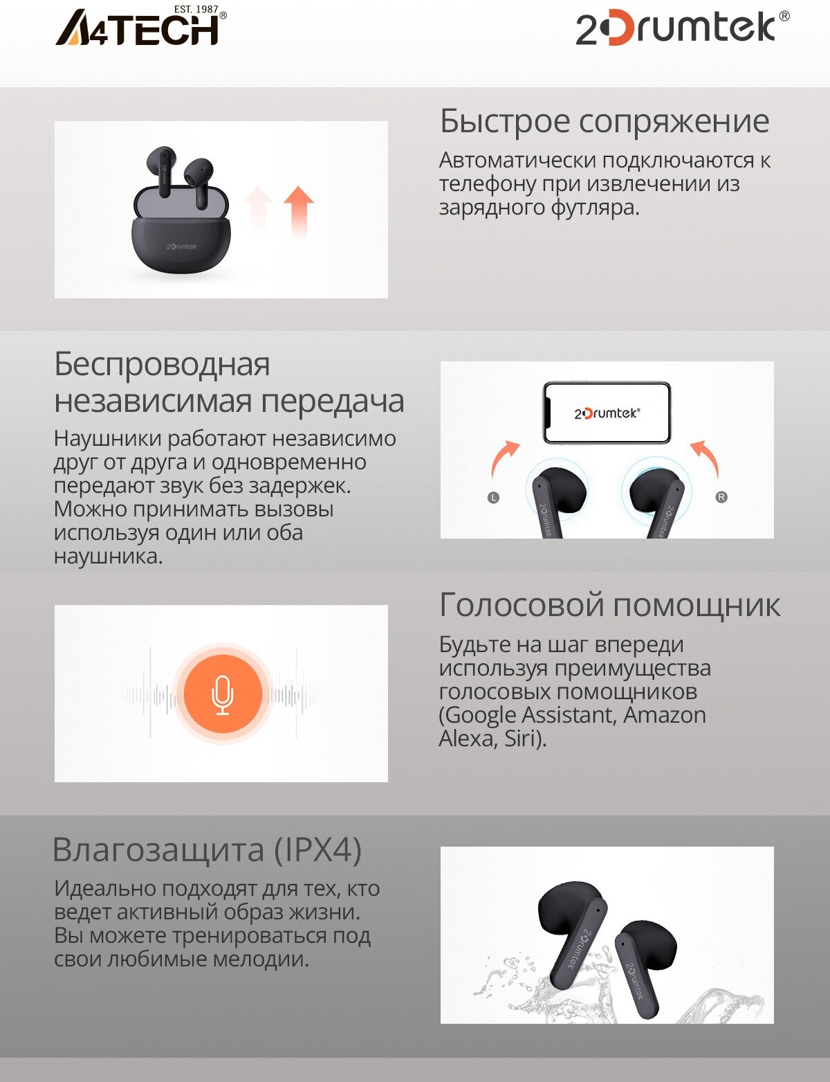 Беспроводная гарнитура A4TECH 2Drumtek B20 TWS bluetooth серый/черный