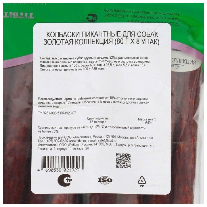 Корм для собак Лакомство TitBit Золотая коллекция для собак "Колбаски Пикантные" 80 г х 8 упак