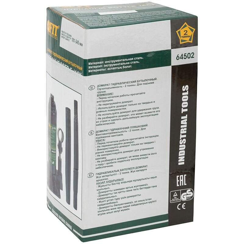 Лучшие цены. Бутылочный гидравлический домкрат FIT грузоподъемностью до 2 тонн отличается простотой и удобством эксплуатации, что расширяет область его использования. Гидравлический домкрат " бутылочного" типа широко применяется при строительстве, ремонте, при различных монтажно-демонтажных работах. Особенности: Большая грузоподъемность в сочетании с небольшим рабочим усилием; Высокий КПД; Жесткость конструкции; Плавность хода; Точность и плавность торможения. Характеристики: Грузоподъемность: до 2 тонн. Магазины в вашем городе.
