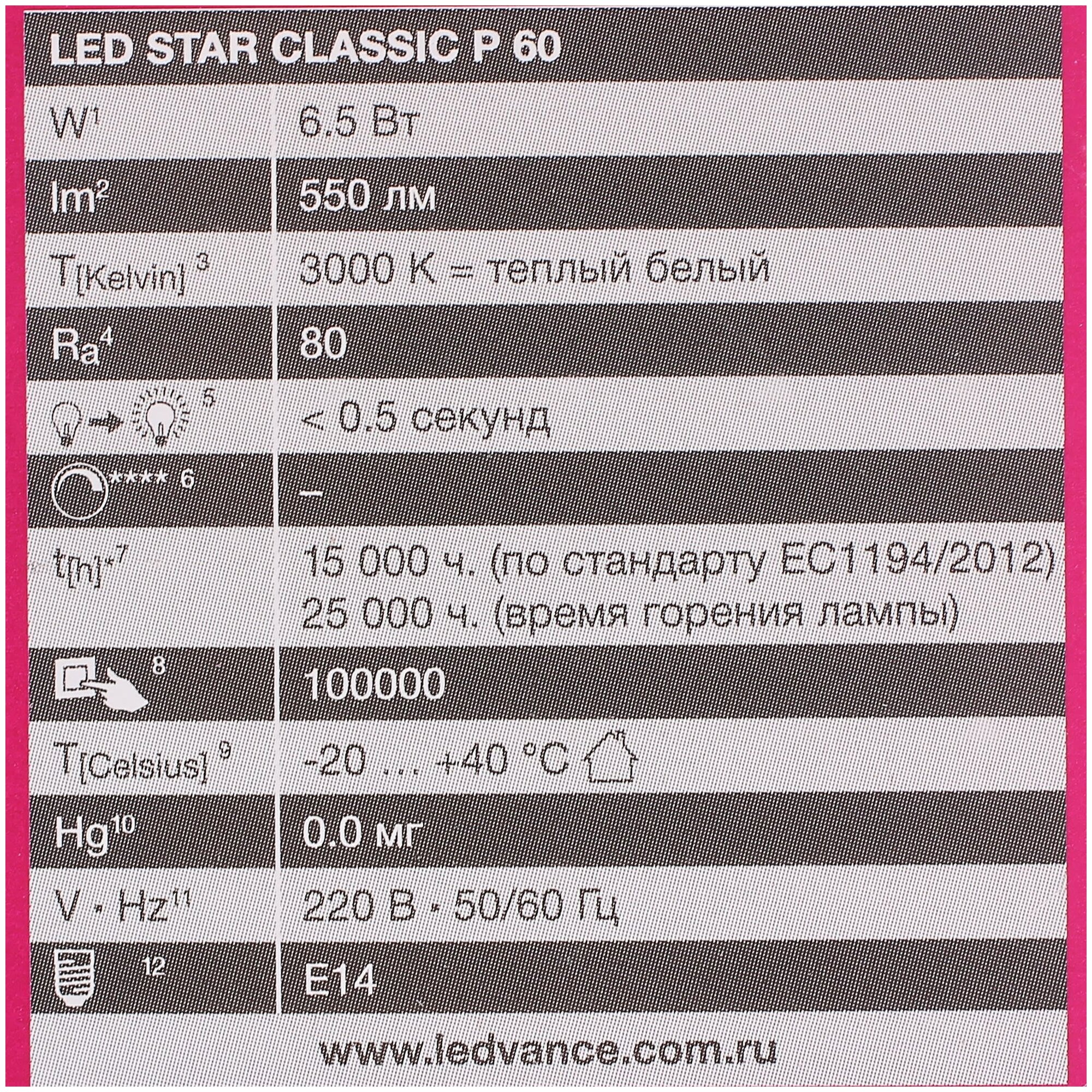 Лучшие цены. Лампа светодиодная Osram с колбой в форме шара станет хорошим выбором для тех, кто стремится снизить расход электроэнергии. Соответствует классу энергопотребления A (высокий уровень энергоэффективности). При потребляемой мощности в 6,5 Вт светодиодная лампа обеспечивает уровень освещения, который дает лампа накаливания мощностью 50 Вт. Характеристики Световой поток — 550 лм. Цоколь — E14. Достоинства светодиодной лампы Низкая температура нагрева — максимум 65 °C вместо 270 °C у лампы накаливания. Магазины в вашем городе.