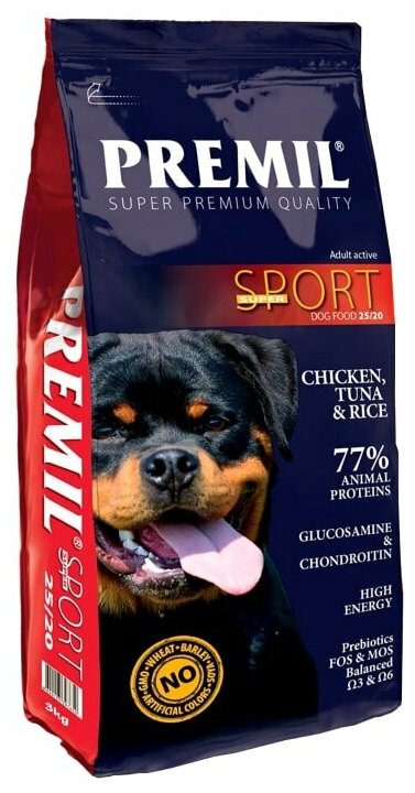 Лучшие цены. Полнорационный сухой корм PREMIL Super Sport для взрослых очень активных и рабочих собак всех пород и величины. Высокоэнергетический корм, обогащенный эссенциальными жирными кислотами и легко усваиваемыми протеинамиов, полученными из мяса высшего качества. Высокий процент энергии с отличным балансом жирных кислот обеспечивает отличную кондицию спортивных и рабочих собак. Магазины в вашем городе.