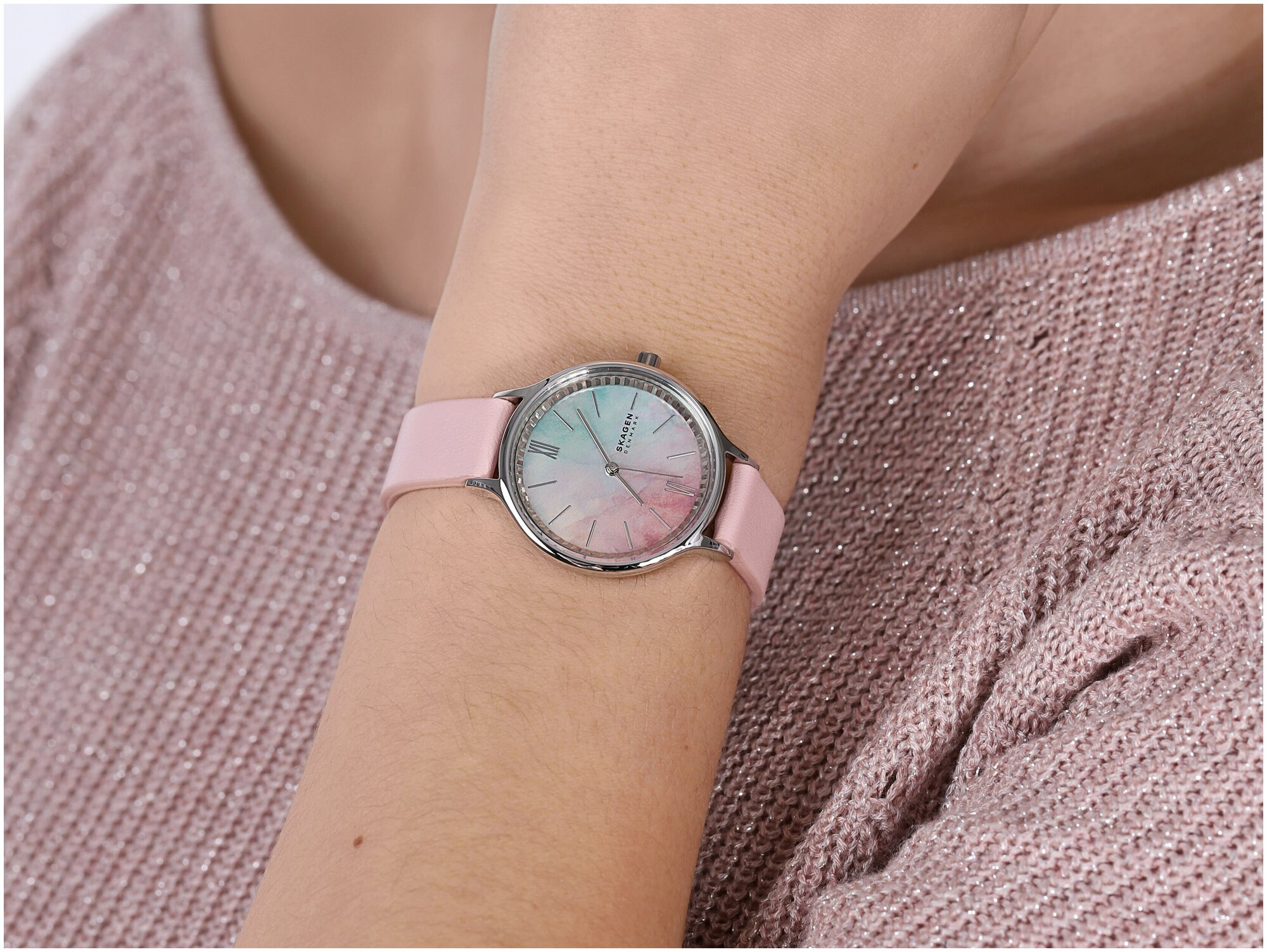 Лучшие цены. Женские часы. Коллекция Anita. Стильные часы станут прекрасным дополнением элегантного образа. Тип механизма: кварцевый. Корпус: сталь. Циферблат: перламутровый розовый, голубой. Браслет: кожаный ремешок. Водозащита: 30WR. Стекло: минеральное. Габаритные размеры: D 30мм. Магазины в вашем городе.