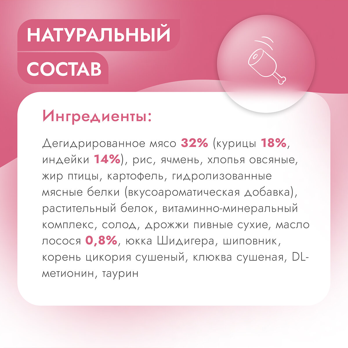 | Ингредиенты | протеин индейки 25%, мясо индейки 5%, злаки, травы, ягоды, масло, жир / витамины, минералы / |