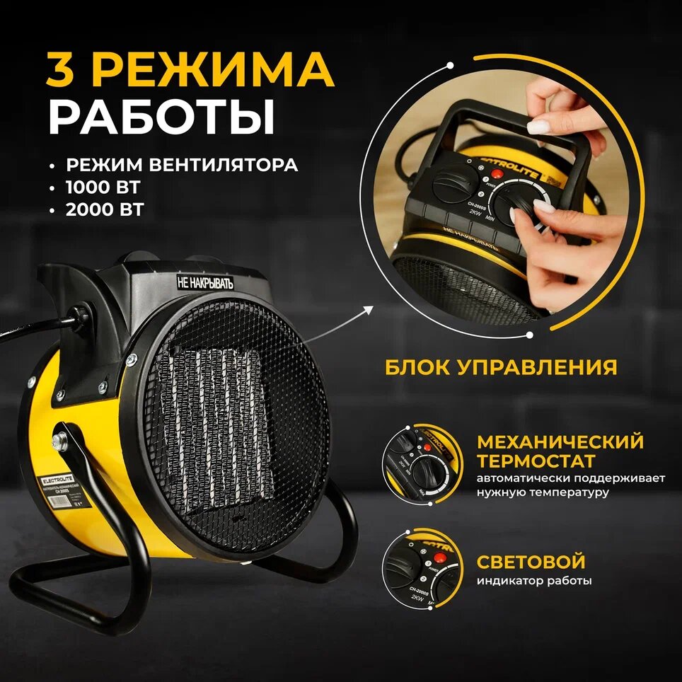 Электрическая/ керамическая тепловая пушка Electrolite CH 2000S (без горелки, 2 кВт, 3 режима работы, керамика, 220 в, с механической регулировкой температуры ) 1 890 ₽ Подробнее