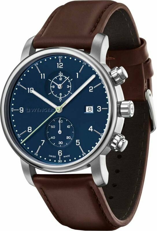 Лучшие цены. Мужские кварцевые часы Wenger 01.1743.125 с хронографом (секундомером). Коллекция Urban Classic Chrono. Калибр механизма — Ronda Z60. На данной модели отображается текущая дата. Стрелки покрыты люминесцентным напылением (светятся в темноте). Установлено минеральное стекло с сапфировым покрытием (устойчивое к царапинам). Кожаный ремешок. Завинчивающаяся задняя крышка часов. Водонепроницаемость WR100 (10 атм). Швейцарская сборка (Swiss made). Официальная гарантия от производителя — 3 года. Магазины в вашем городе.