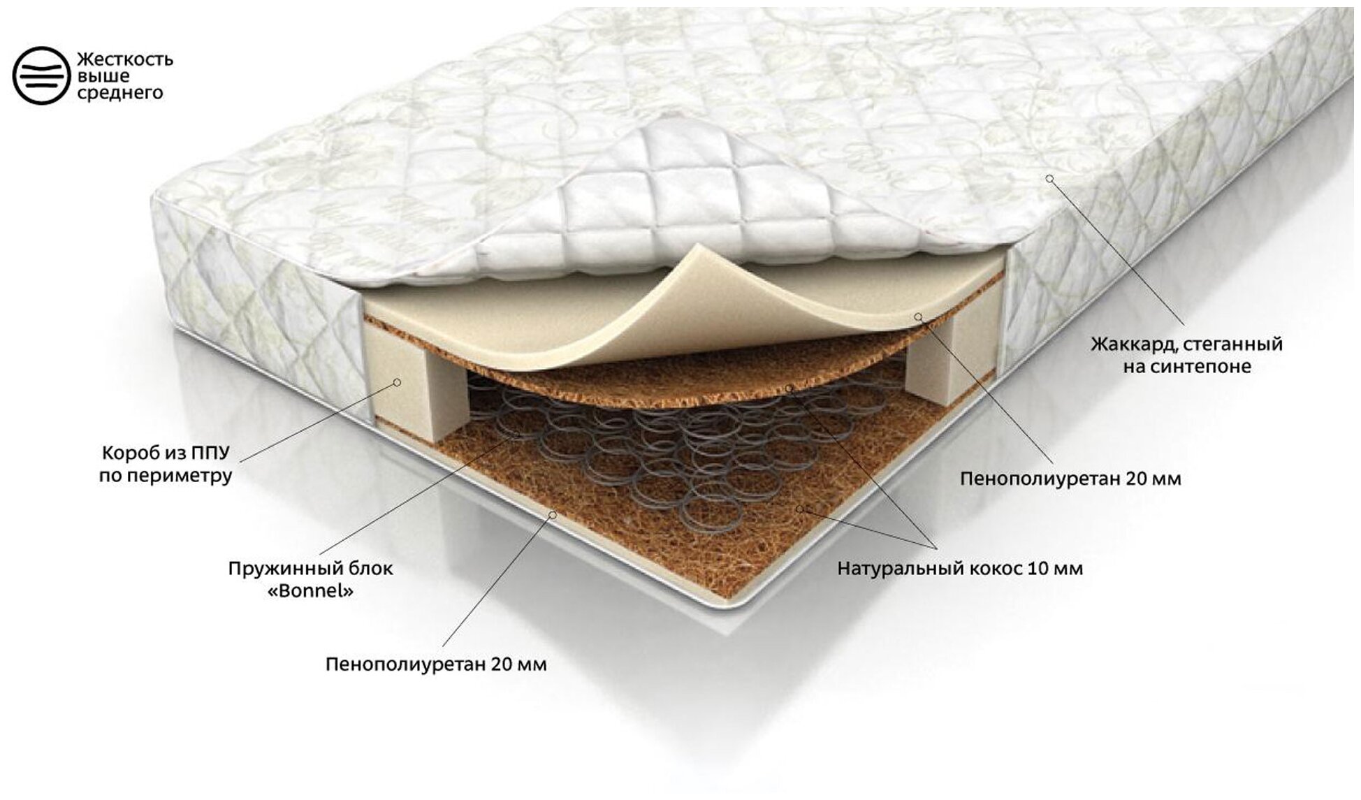 Лучшие цены. Классический матрас на основе пружинного блока Боннель с настилом из натуральной кокосовой плиты. Эластично скрепленные волокна кокоса оптимально распределяют нагрузку, обеспечивая оптимальный уровень жесткости и поддержки. Жесткость приближена к матрасу balance extra, и поэтому модель рекомендована тем, кто предпочитает уровень жесткости выше среднего. Состав жаккард, стеганный с синтепоном эластичная пена натуральное кокосовое волокно пружинный блок Bonnel натуральное кокосовое волокно эластичная пена. Магазины в вашем городе.