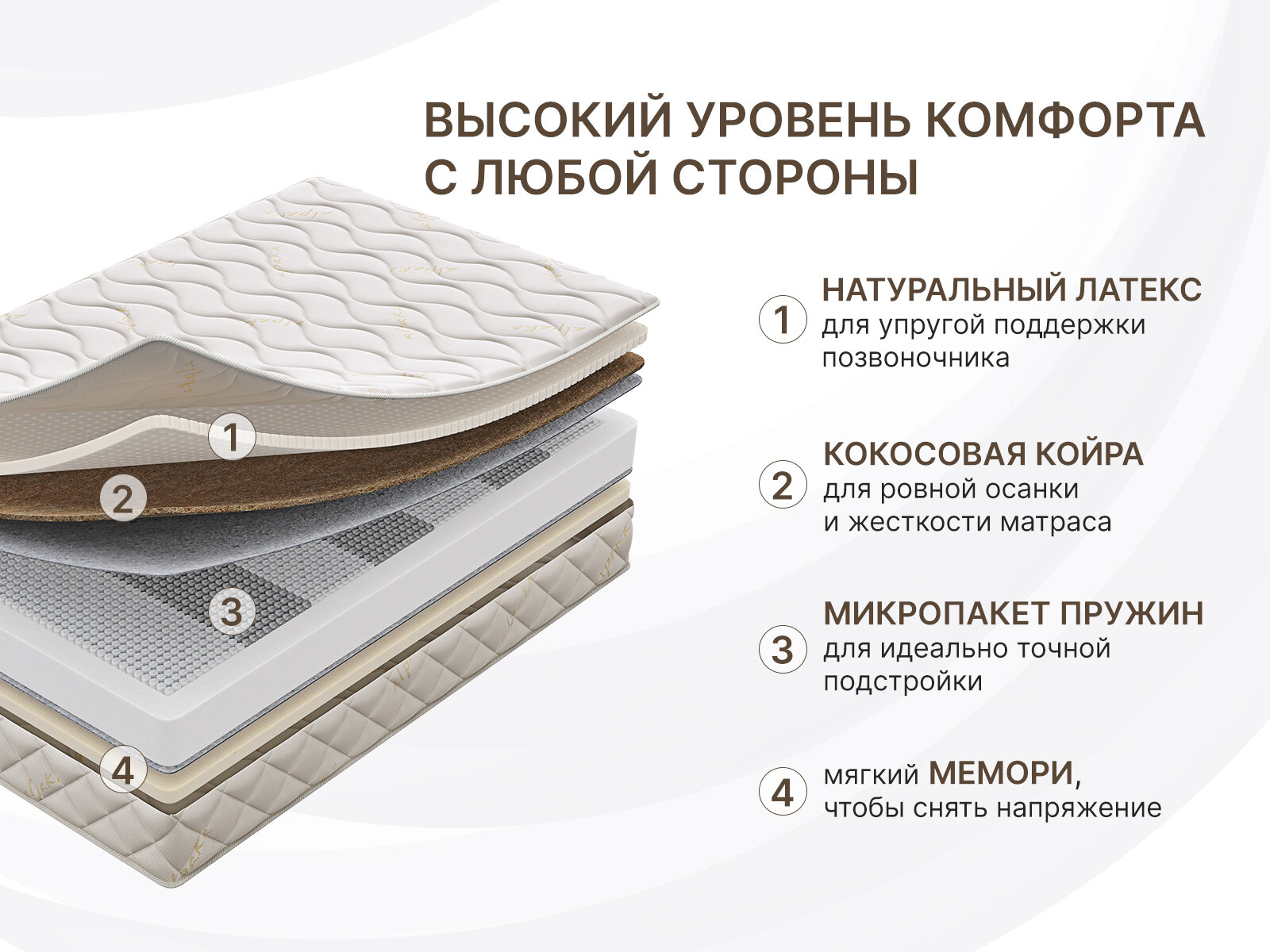 Лучшие цены. Пружинный блок матраса Микро Медиум Мемо состоит из 1000 пружин на метр кв. или 2000 пружин на спальное место. Пружины усилены блоком ППУ по периметру. Спальная поверхность обладает высокими анатомическими свойствами. Блок не скрипит и не провисает. У матраса трехслойное наполнение. С одной стороны проложена комбинация натурального латекса и койры кокоса, со второй стороны расположился инновационный материал с эффектом памяти Memory. Memory обладает мягкостью, дарит комфорт и уют. Магазины в вашем городе.
