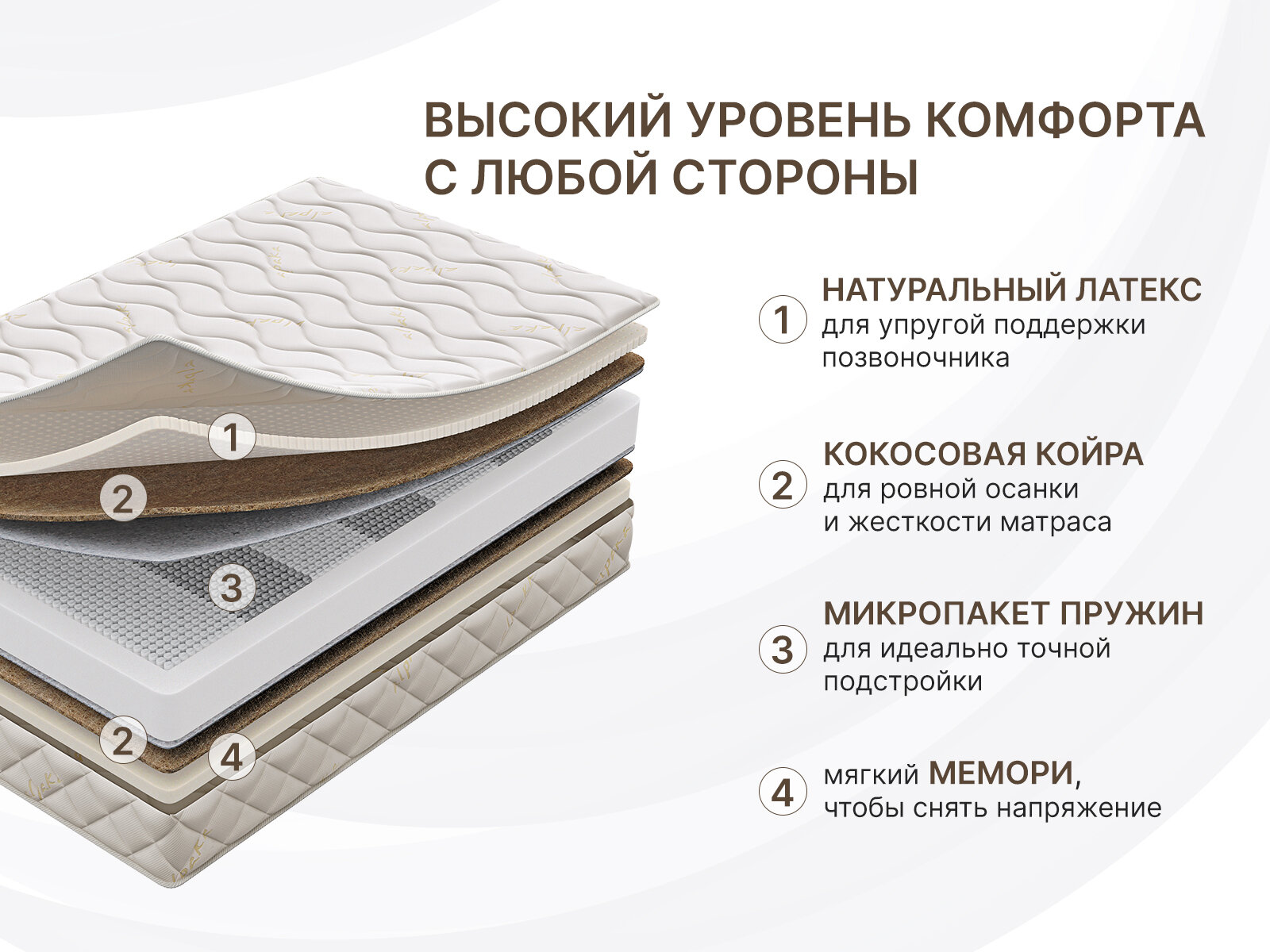 Лучшие цены. Премиальный матрас Микро Медиум Мемо Софт – это идеальный союз комфорта и мягкой физиологичной поддержки. Сбалансированная средняя жёсткость сторон и элитные наполнители создают по истине королевское ложе, которые позволит полноценно отдохнуть и выспаться даже самым взыскательным и требовательным натурам. Матрас получил две стороны комфорта с уровнем жесткость чуть выше среднего. Несмотря на равный уровень мягкости, спальные поверхности будут отличаться по ощущениям. Магазины в вашем городе.