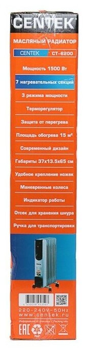 Лучшие цены. Масляный радиатор Centek CT-6200 – эффективный, простой в использовании и безопасный обогреватель, рассчитанный на площадь до 15 кв. м. Он создаст дома или в офисе комфортную атмосферу и поможет избежать неудобств, связанных с капризами погоды. без труда разберётесь У этой модели надёжное механическое управление, которое не доставит сложностей в освоении. К вашим услугам два поворотных регулятора. Верхний отвечает за выбор уровня мощности (0,7, 1 или 1,5 кВт), а нижний позволяет регулировать температуру. Магазины в вашем городе.