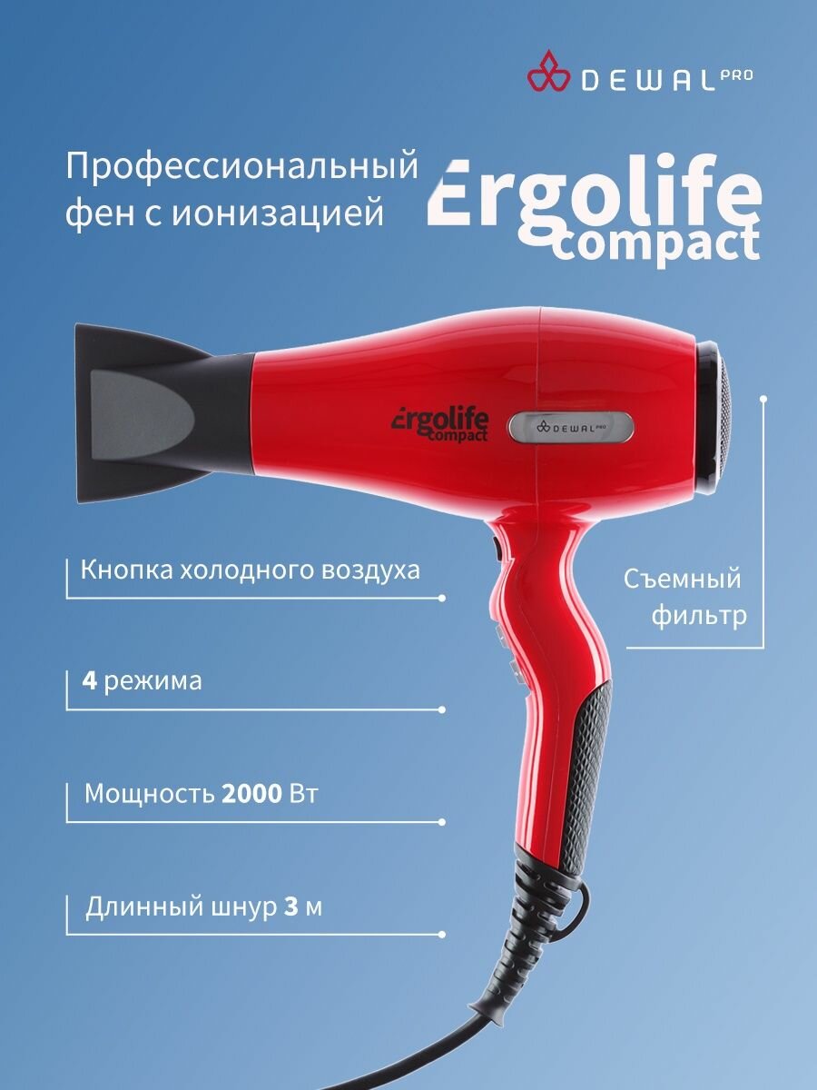 Фен DEWAL PRO ERGOLIFE COMPACT c ионизацией, красный, вес 550 гр, 2000 Вт, 2 насадки, провод 3 м 03-002 Red