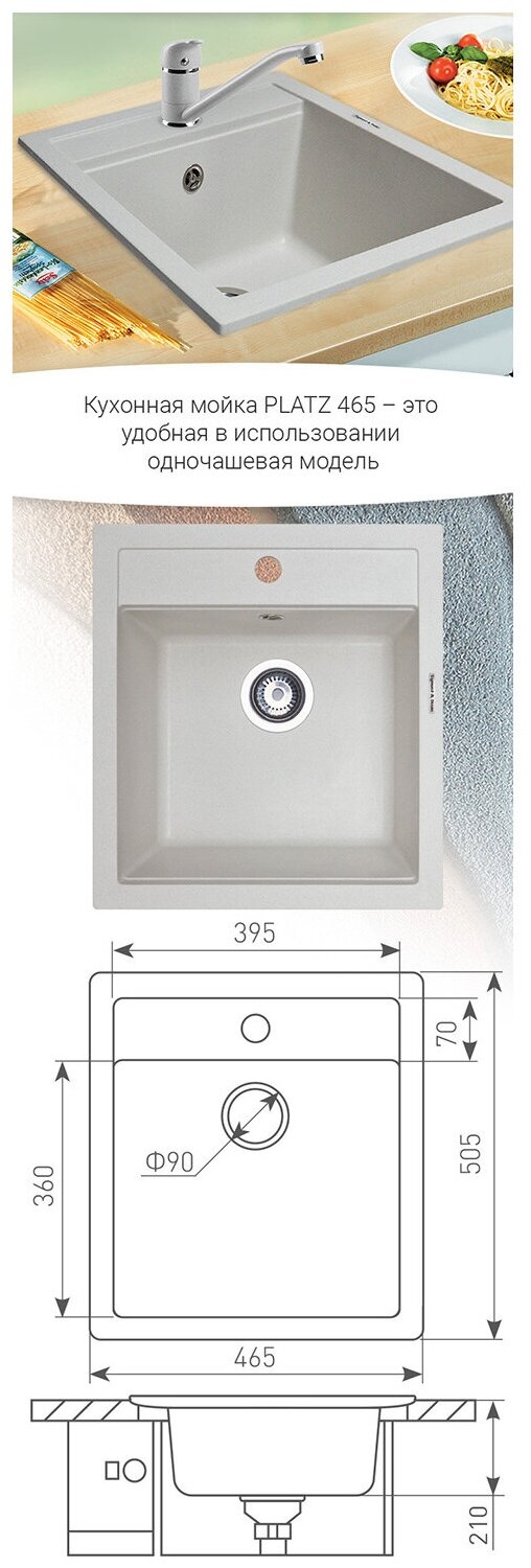 Лучшие цены. Благодаря небольшим габаритам, но при этом достаточно большой чаше, модель PLATZ 465 прекрасно подойдёт как для небольшой семьи, так и для холостятской квартиры, куда часто захаживают гости. Квадратная форма позволяет использовать мойку с максимальной отдачей. Такая мойка будет органично смотреться в интерьере каждой кухни & она будет геометрически перекликаться со столешницей прямоугольной формы и выгодно контрастировать с поверхностью с округлыми краями. Магазины в вашем городе.