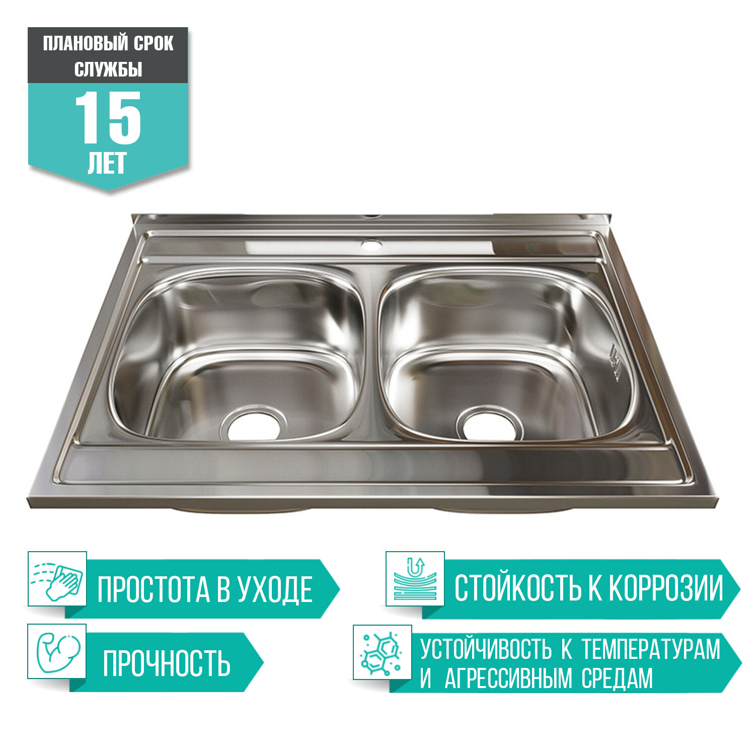 Накладная кухонная мойка Mixline из нержавеющей стали двухчашевая прямоугольная 60х80 см выпуск 3 1/2 глубина 18 см