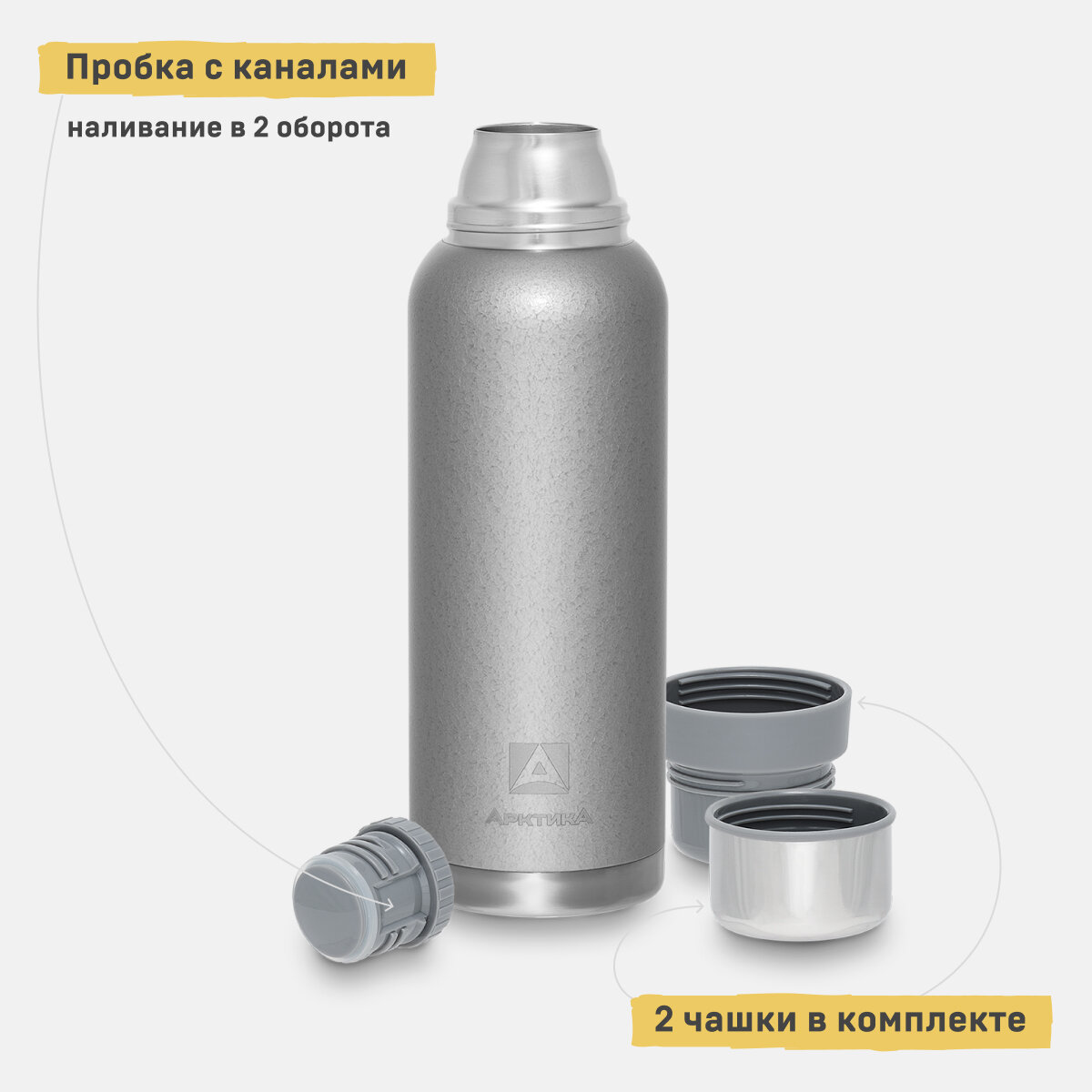 Термос для чая и кофе Арктика 106-1200 серебристый 1,2 литров с двумя чашками в комплекте 2 690 ₽ Подробнее