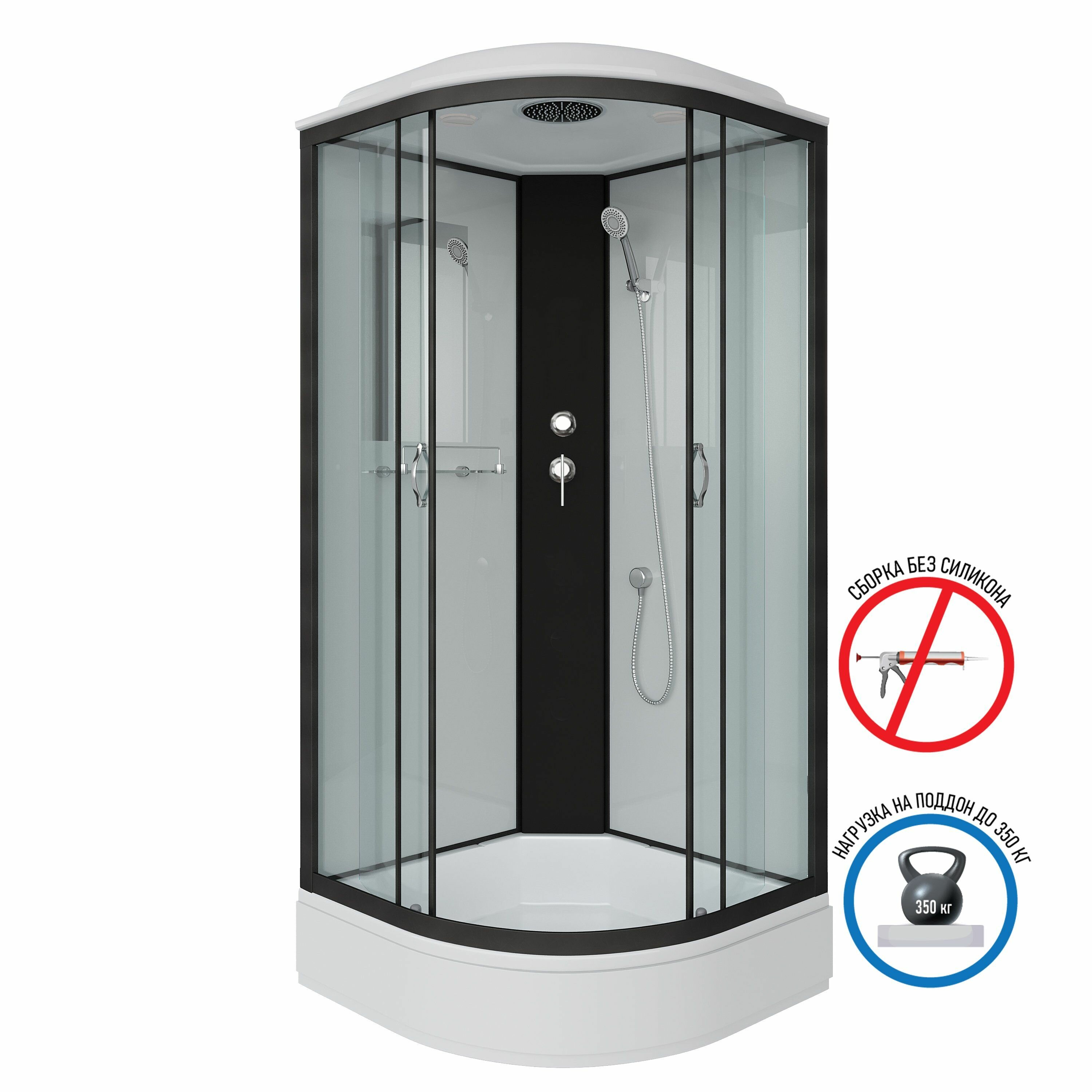 Лучшие цены. Бессиликоновая душевая кабина Niagara NG 6701-14 черный профиль Недорогая душевая кабинка на акриловом усиленном поддоне, размер 90x90x215 см. Подходит для любых помещений, назначение ванная комната в доме, на дачу или в квартиру. Средний поддон, высота от пола 26 см, глубина 13 см. Чаша установлена на металлический каркас, он обеспечивает устойчивость, прочность. Поддон не скрепит и не трещит, есть антискользящее покрытие. Максимальная нагрузка до 300 кг. Магазины в вашем городе.