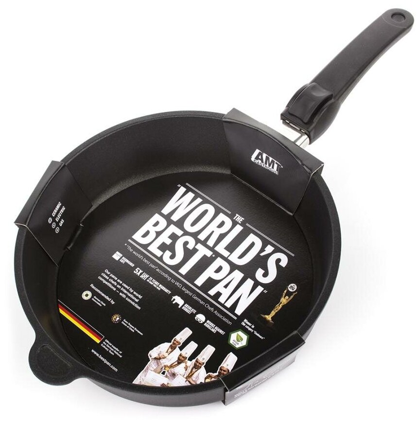 Лучшие цены. Сковорода сотейник 24см AMT Gastroguss Frying Pans Глубокая сковорода-сотейник с качественным антипригарным покрытием и удобной съемной ручкой прекрасно подойдет для ежедневного использования. Отливается вручную из высокосортного алюминиевого сплава. Благодаря особо прочному дну, изготовленному из литого алюминия, и имеющему толщину 10 мм, весь корпус сковороды обладает превосходным теплопоглощением и оптимальной теплопроводностью. Деформация термодна невозможна даже при высоких температурах. Магазины в вашем городе.
