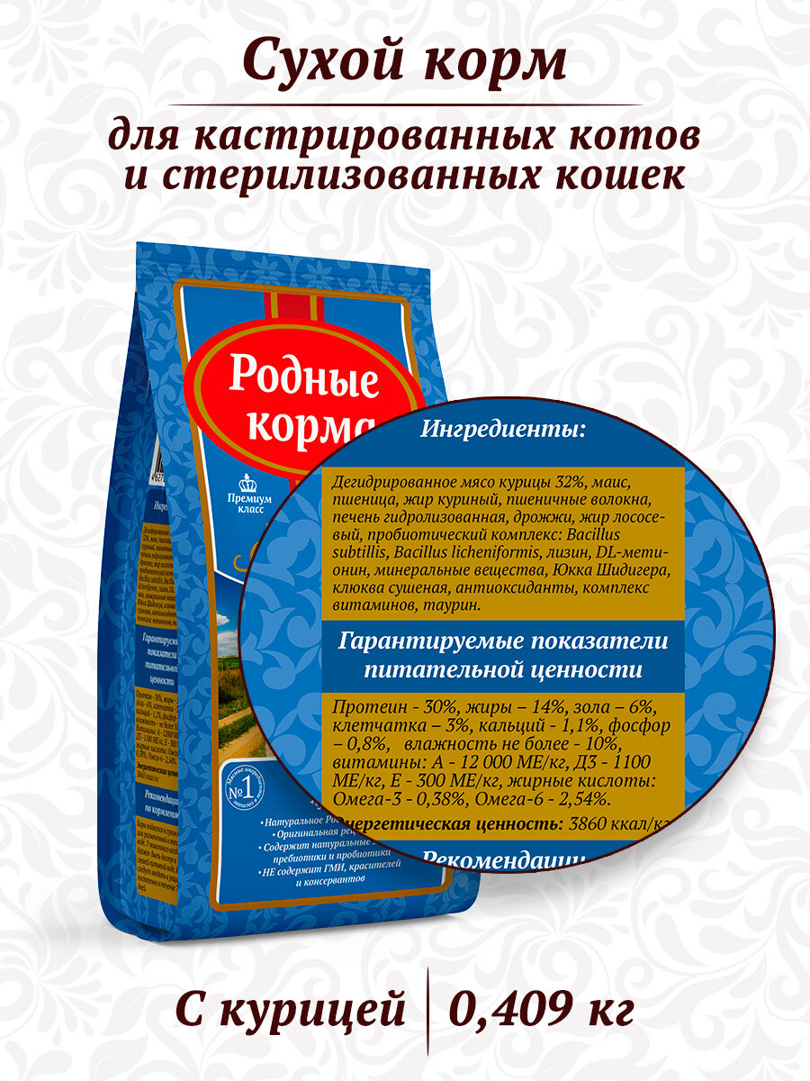 Лучшие цены. Сухой корм для взрослых кастрированных котов и стерилизованных кошек Родные корма с Курицей. Сбалансированная формула корма "Родные корма", обогащенная витаминами и минералами, поможет вырасти вашему питомцу сильным и здоровым. Комплекс минералов поможет формированию крепкого скелета и обеспечит гармоничный рост на протяжении всей жизни. В корме не содержится соя, искусственные красители, ароматизаторы и химические консерванты. Магазины в вашем городе.