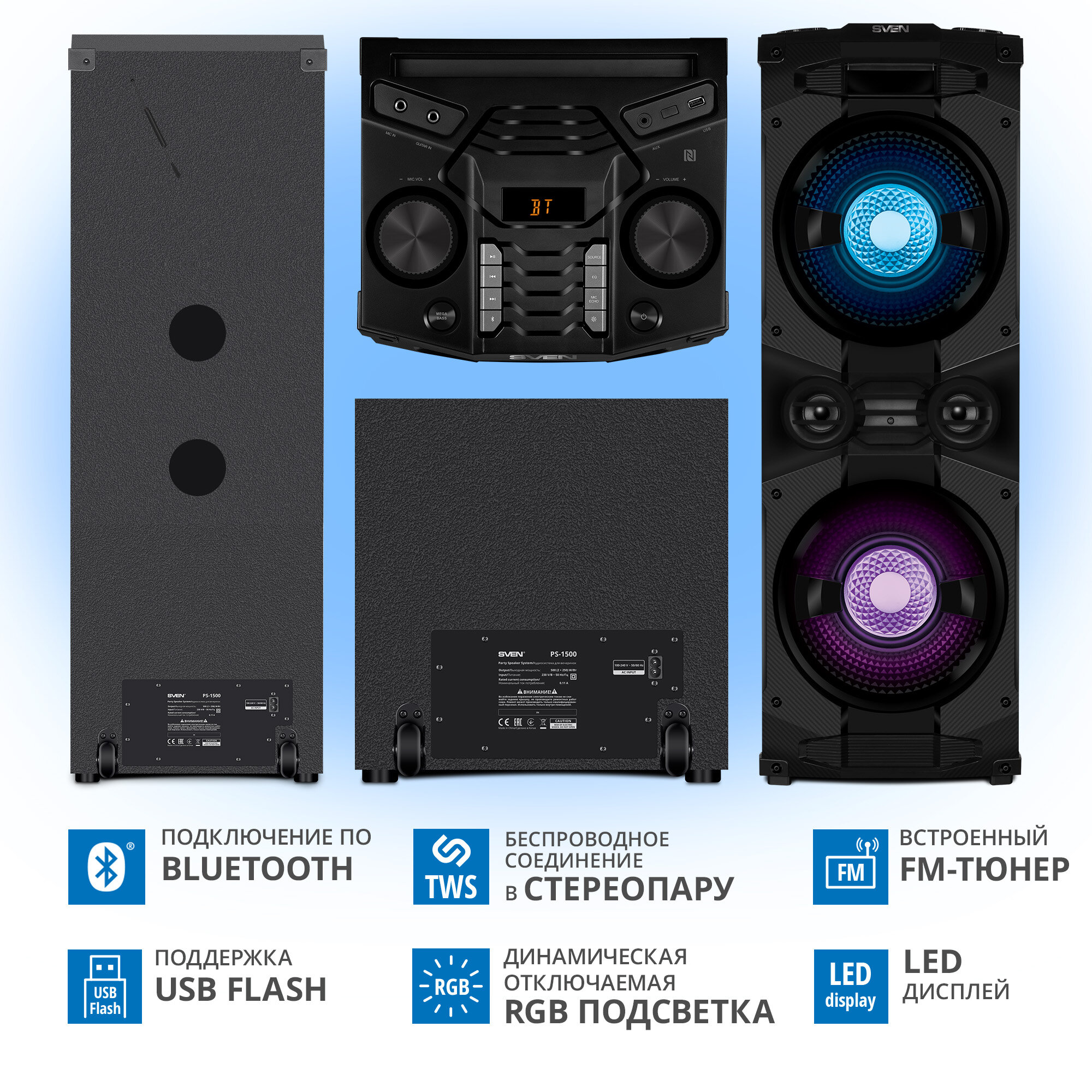 Аудиосистемы Колонка портативная беспроводная bluetooth SVEN PS-1500 / 500 Вт / Bluetooth / FM / USB / LED-дисплей