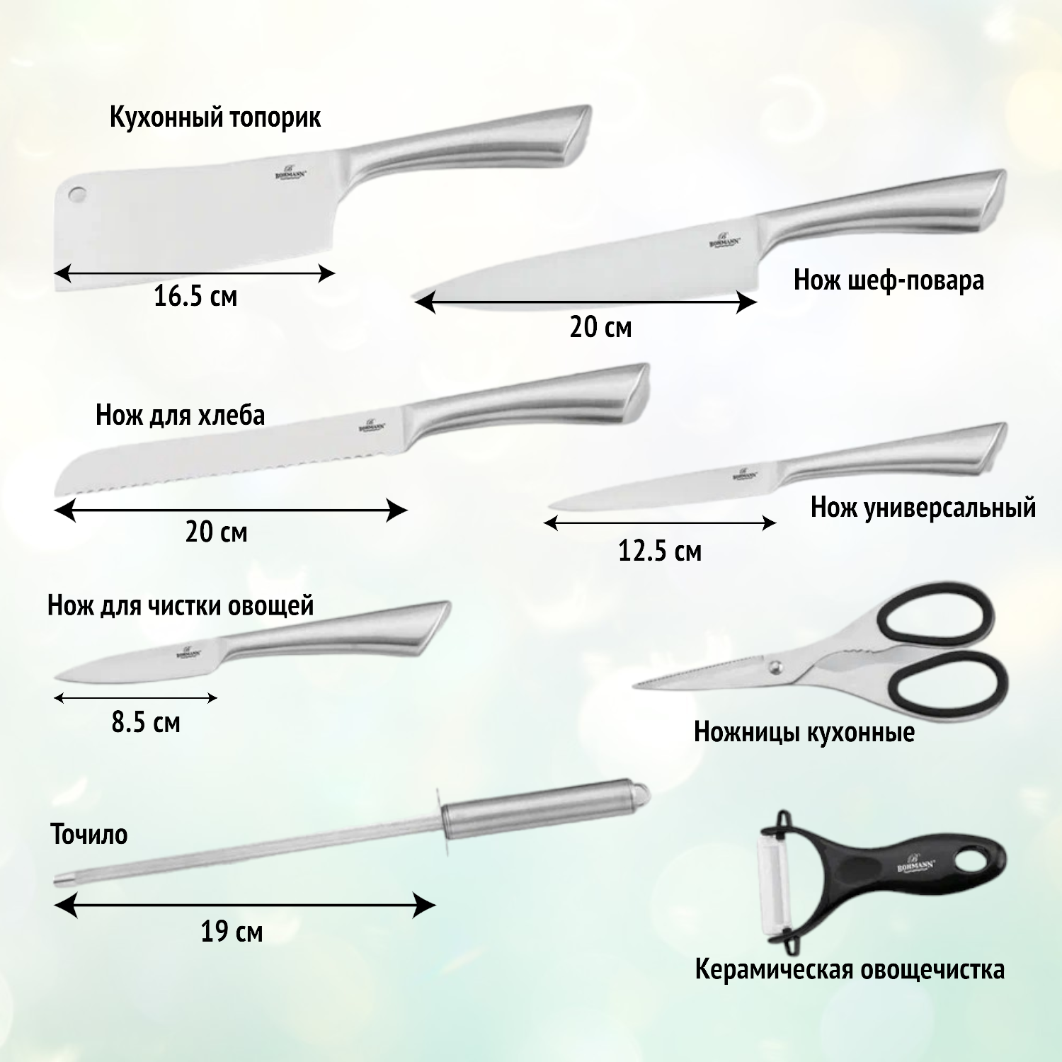 | Ножи | универсальный, поварской, для очистки, для хлеба, топорик |