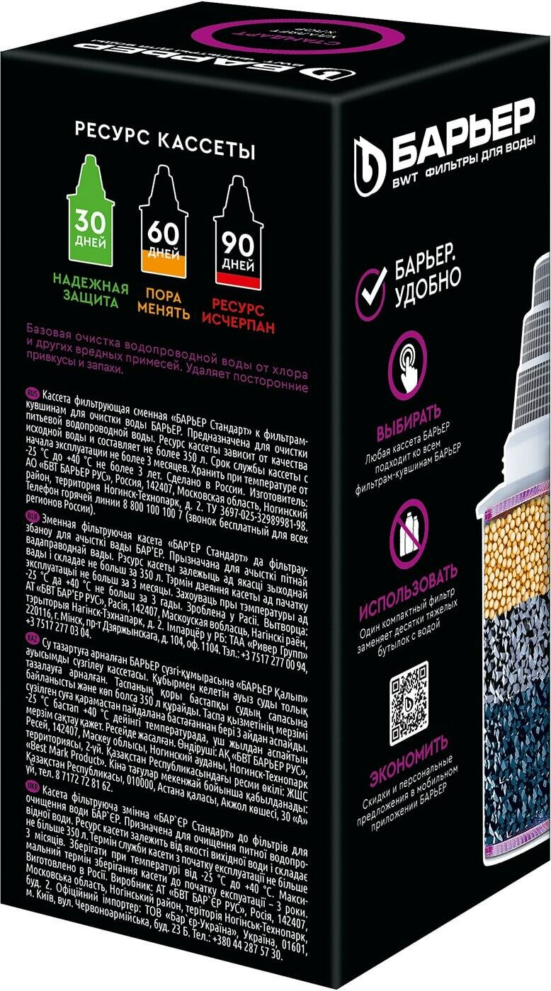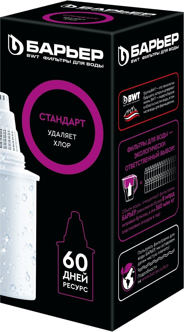 Лучшие цены. Сменная кассета для фильтра Барьер Стандарт с увеличенным ресурсом подходит ко всем фильтр-кувшинам одноименного бренда. Предназначена для базовой очистки водопроводной воды от хлора и других примесей, негативно влияющих на состояние нашего здоровья. Также из жидкости удаляются характерный запах и неприятный привкус. Применена технология «NanoPlus»: миллиарды нанопор удерживают мельчайшие молекулы веществ, поэтому по качеству и вкусу такая вода не уступает, а в ряде случаев и превосходит бутилированную. Магазины в вашем городе.