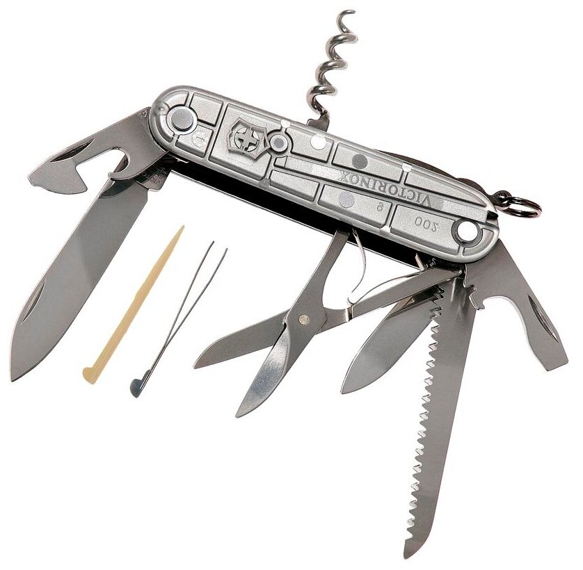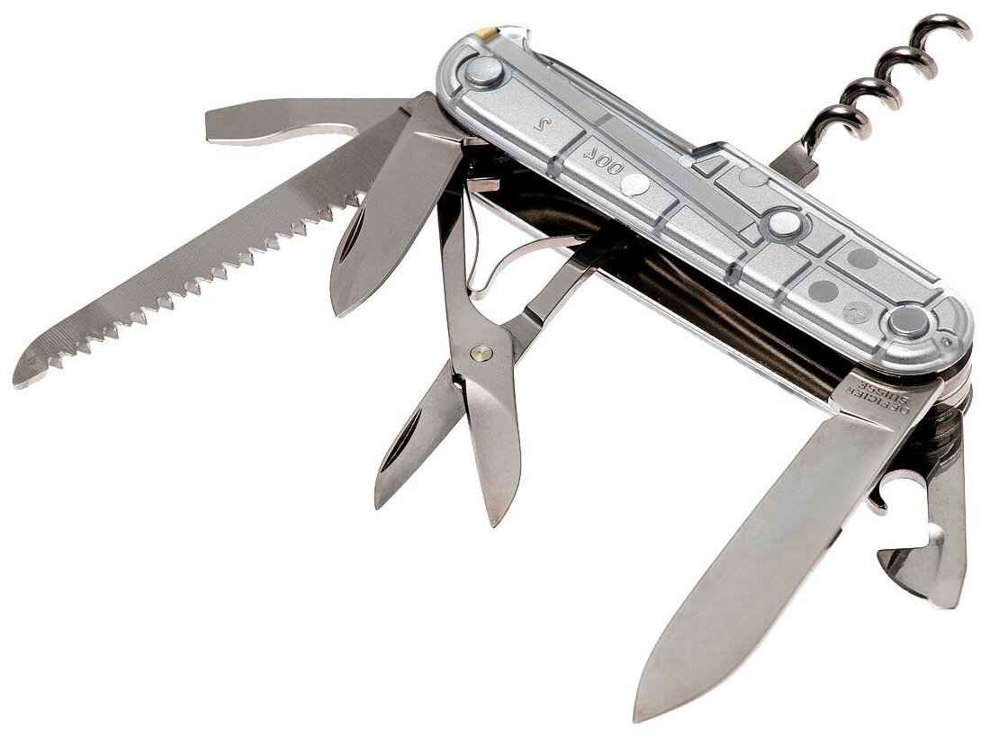Лучшие цены. Швейцарский армейский нож HUNTSMAN имеет 15 функций: 1. Большое лезвие 2. Малое лезвие 3. Штопор 4. Консервный нож с: 5. – Малой отвёрткой 6. Открывалка для бутылок с: 7. – Отвёрткой 8. – Инструментом для снятия изоляции 9. Шило, кернер 10. Кольцо для ключей 11. Пинцет 12. Зубочистка 13. Ножницы 14. Многофункциональный крючок 15. Пила по дереву Цвет рукояти: полупрозрачный серебристый Рекомендуемые чехлы: 4.0480.1, 4.0480.3, 4.0520.1, 4.0520.3, 4.0520.31, 4.0520.32, 4.0543.3, 4.0533, 4.0738 Рекомендуемые. Магазины в вашем городе.