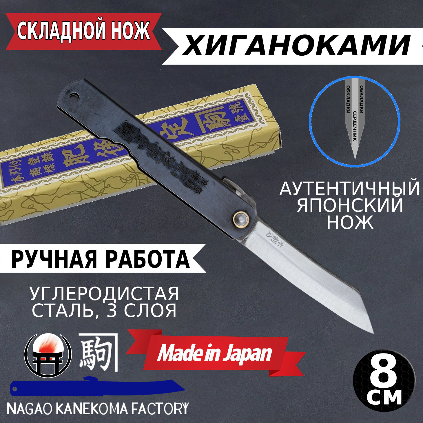 Нож / мультитул Nagao Kanekoma 100 Black (8BL) — Складной нож Хигоноками, высокоуглеродистая сталь, 3 слоя