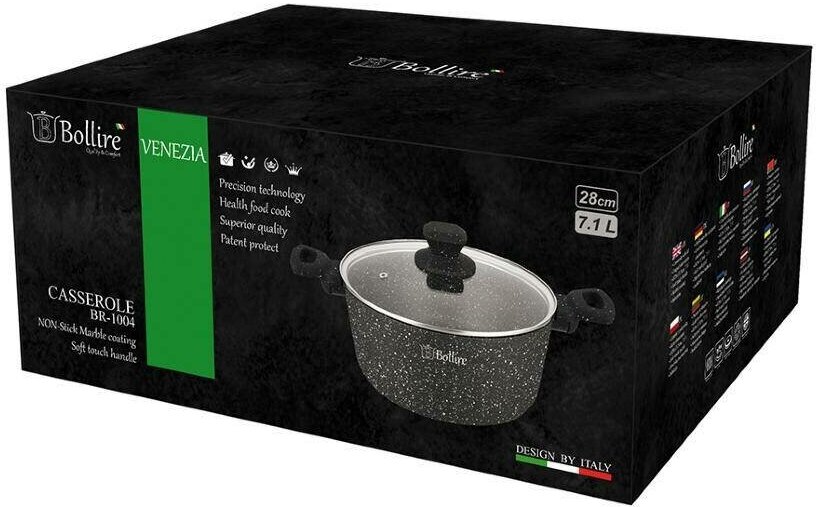 Лучшие цены. Кастрюля Bollire VENEZIA 7,1 литра артикул BR-1004 Кастрюля с крышкой BR-1004 выполнена из высококачественного кованого алюминия, превращая процесс варки пищи в удовольствие. Внутреннее покрытие ковша Bollire из трёхслойного износостойкого антипригарного покрытия PFLUON Marble. Внешнее покрытие кастрюли состоит из двухслойного износостойкого антипригарного покрытия PFLUON Marble. Объём кастрюли Bollire составляет 7,1 литра. Кастрюля BR-1004 оснащёна крышкой из термостойкого стекла. Магазины в вашем городе.