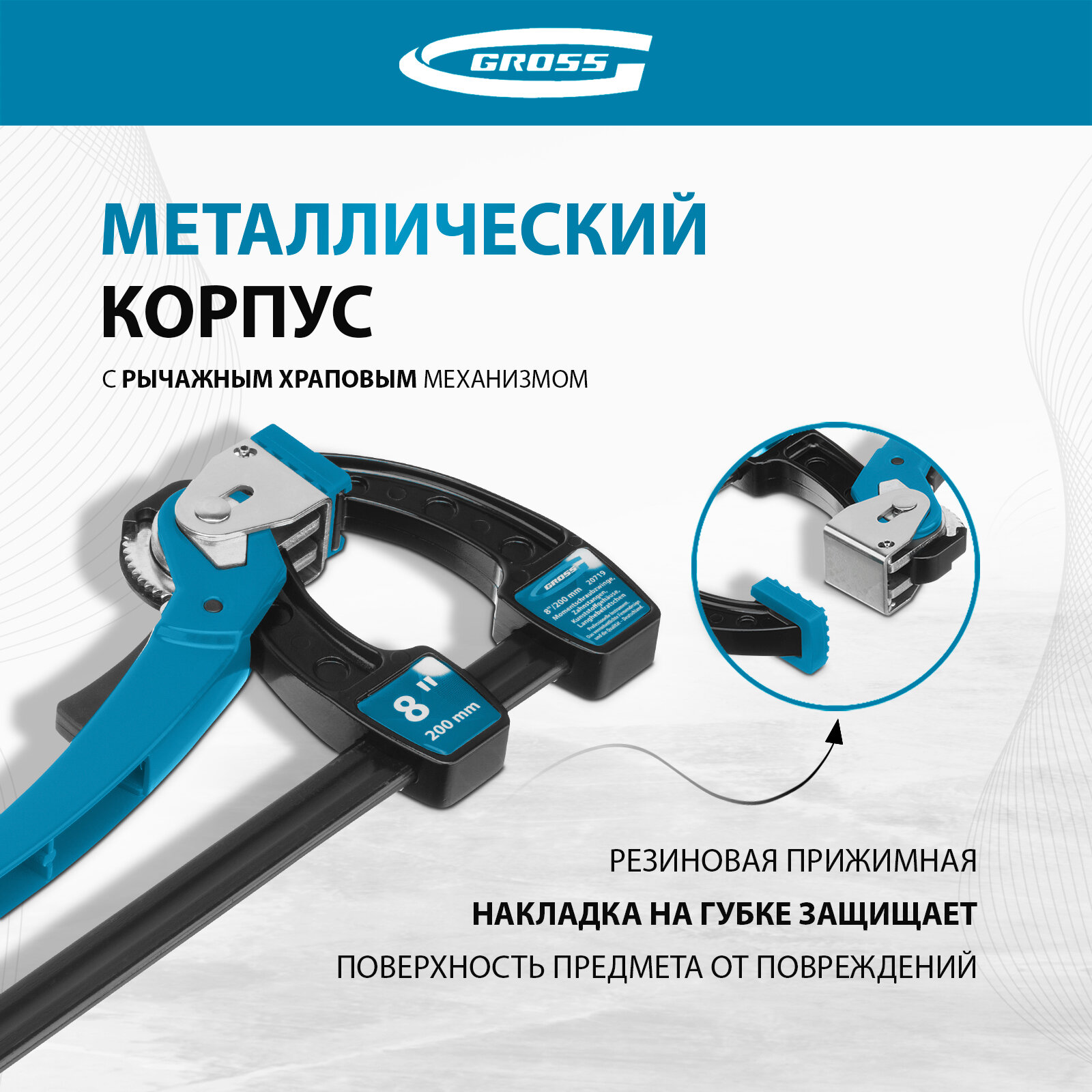 Струбцина Gross 20719, реечная, металлический корпус, храповый механизм, 8"/200 мм