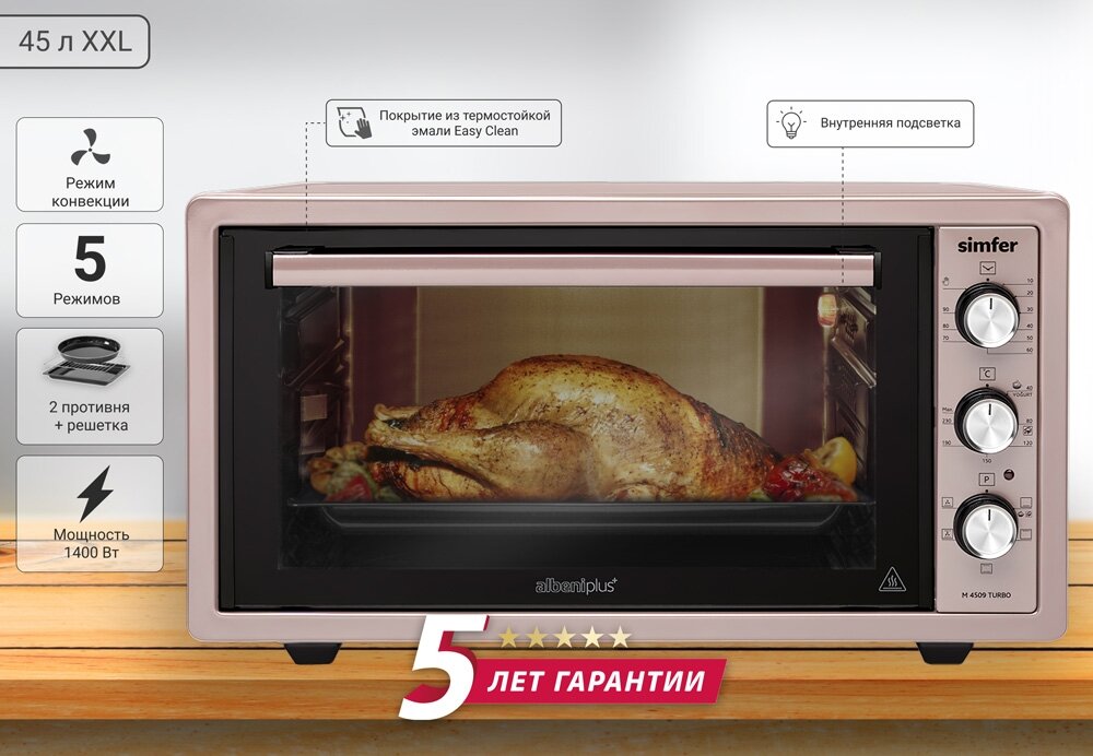 Лучшие цены. Настольная электродуховка Simfer M4509 может стать реальной альтернативой обычной газовой или электрической плите. Мини-печь выпускается под известным турецким брендом бытовой техники в серии Albeni Plus Comfort. Она отличается компактными размерами, небольшим весом и достаточно вместительным объемом внутренней камеры. Наглядным отличием электропечи от других моделей этой серии выступает мягко-розовый цвет корпуса и большей части панели управления. Магазины в вашем городе.