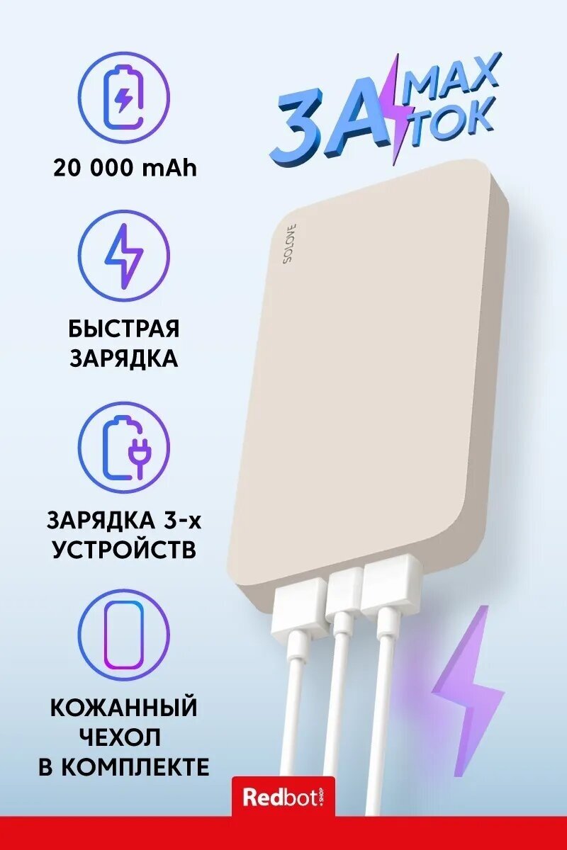 Внешний аккумулятор Power Bank SOLOVE 20000mAh 18W Quick Charge 3.0. Dual USB с 2xUSB выходом, кожаный чехол (003M Beige), бежевый