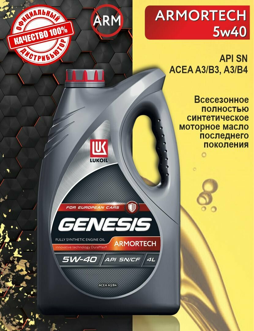 Лучшие цены. ЛУКОЙЛ GENESIS ARMORTECH 5W-40 - всесезонное полностью синтетическое моторное масло последнего поколения для применения во всех современных высокофорсированных двигателях легковых, легких грузовых, спортивных автомобилей и микроавтобусов, в том числе оборудованных турбонаддувом. Подходит для автомобилей марок: AUDI, BMW, CHERY, CITROEN, GEELY, GREAT WALL, HYUNDAI, KIA, LEXUS, LIFAN, MERCEDES-BENZ, MINI, MITSUBISHI, NISSAN, PEUGEOT, PORSCHE, RENAULT, SEAT, SKODA, SSANGYONG, SUBARU, SUZUKI, TOYOTA, VOLKSWAGEN. Магазины в вашем городе.