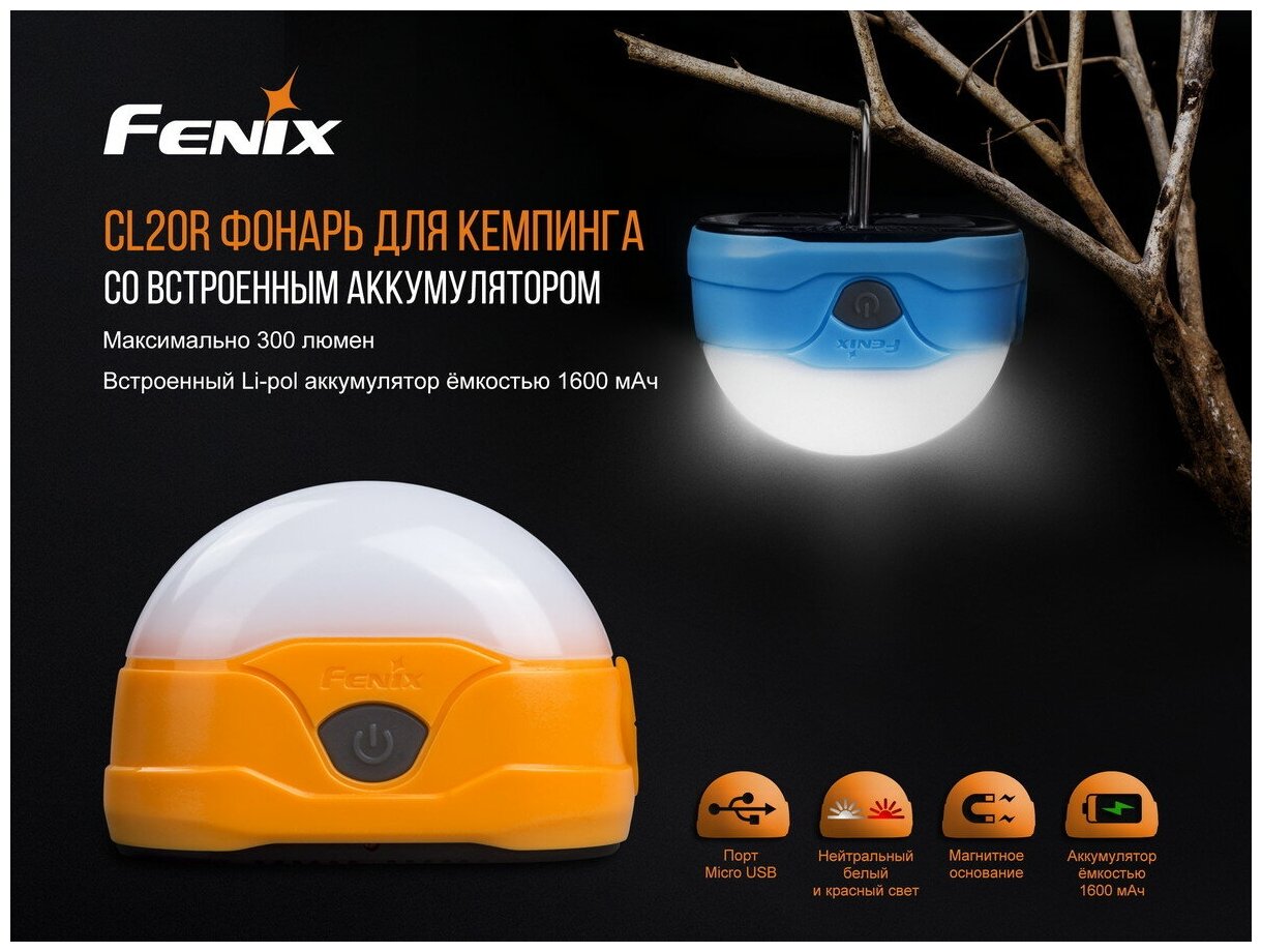 Фонарик Фонарь кемпинговый Fenix Cl20r оранжевый, (свой Акб, зарядка от USB ), 300 Ansi, ip-66 .