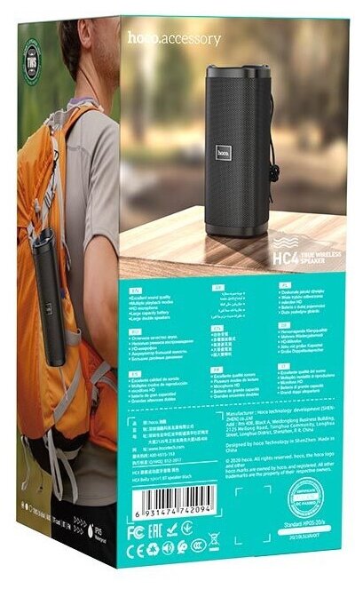 Портативная колонка Hoco HC4 Bella, 1500мАч, 2 динамика 5Вт, BT5.0, AUX, TWS, FM, MicroSD, USB, IPX5, черный
