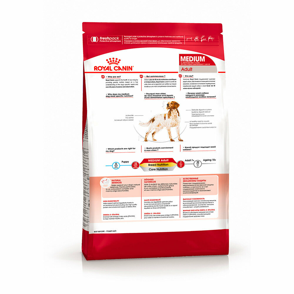 Лучшие цены. К 12 месяцам ваша собака средних размеров становится взрослой с точки зрения физического развития. Но в этот период качественное питание важно для нее в той же степени, что и в период роста. Обеспечьте своей собаке рацион, содержащий все необходимые питательные вещества в правильных пропорциях для поддержания ее здоровья. Продукт ROYAL CANIN® Medium Adult разработан специально для удовлетворения особых потребностей вашей собаки средних размеров (вес взрослой собаки от 11 до 25 кг) в возрасте от 1 до 7 лет. Магазины в вашем городе.
