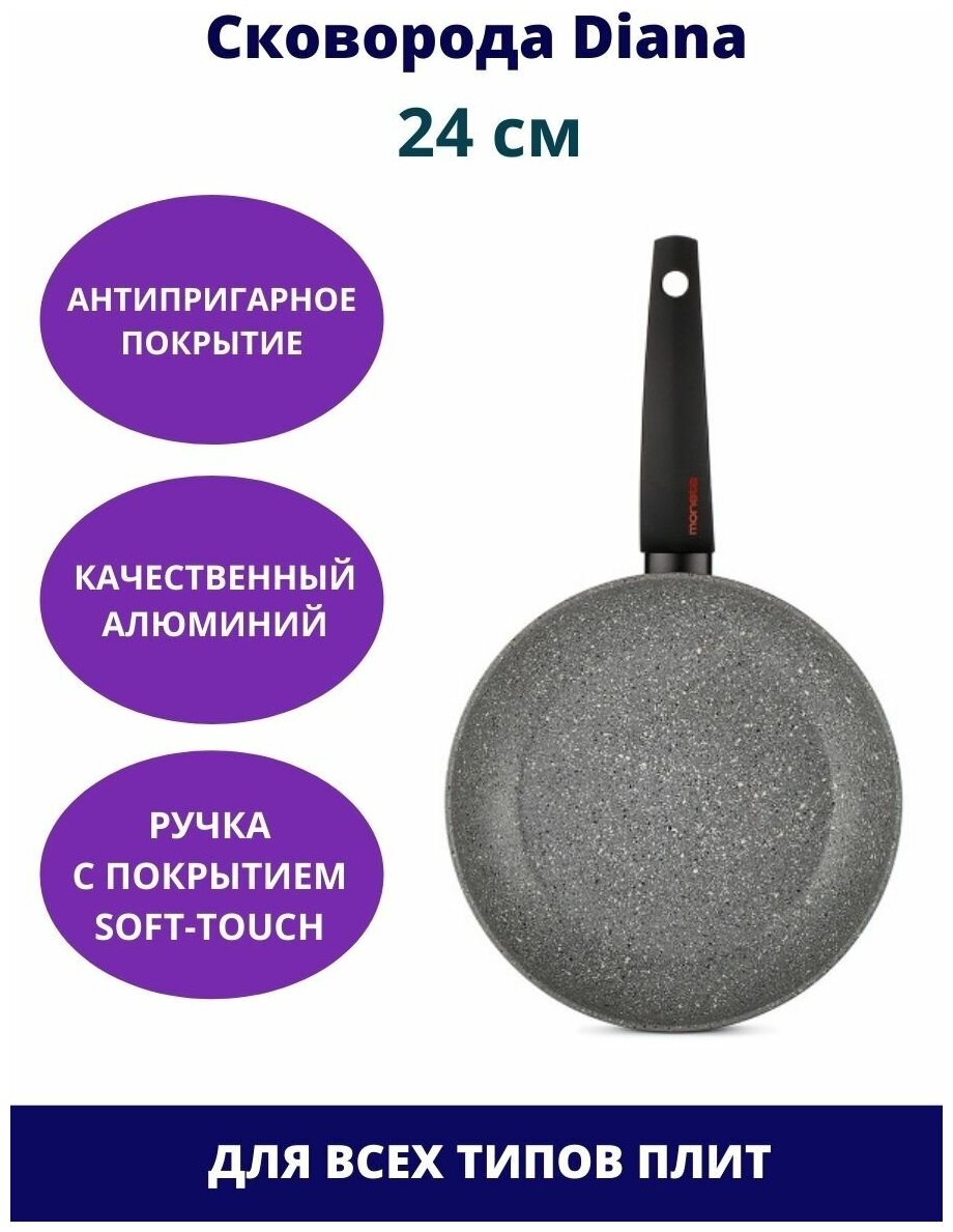 Лучшие цены. Сковорода Diana 24см индукция. Сковорода итальянского MONETA Diana изготовлена из высококачественного алюминия. Снаружи сковорода покрыта антипригарным покрытием темно-графитового, матового цвета. Внутри сковорода покрыта минеральным покрытием, ручка из бакелита с покрытием SoftTach. Антипригарное покрытие имеет 4 слоя, что гарантирует долговременное использование без потери антипригарных свойств. Сковорода подходит для любых плит, в том числе индукционных, и ее можно мыть в посудомоечной машине. Магазины в вашем городе.
