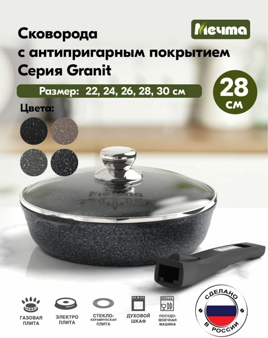 Сковорода "Мечта" 28см Гранит с антипригарным покрытием со съемной ручкой и крышкой, можно мыть в посудомоечной машине