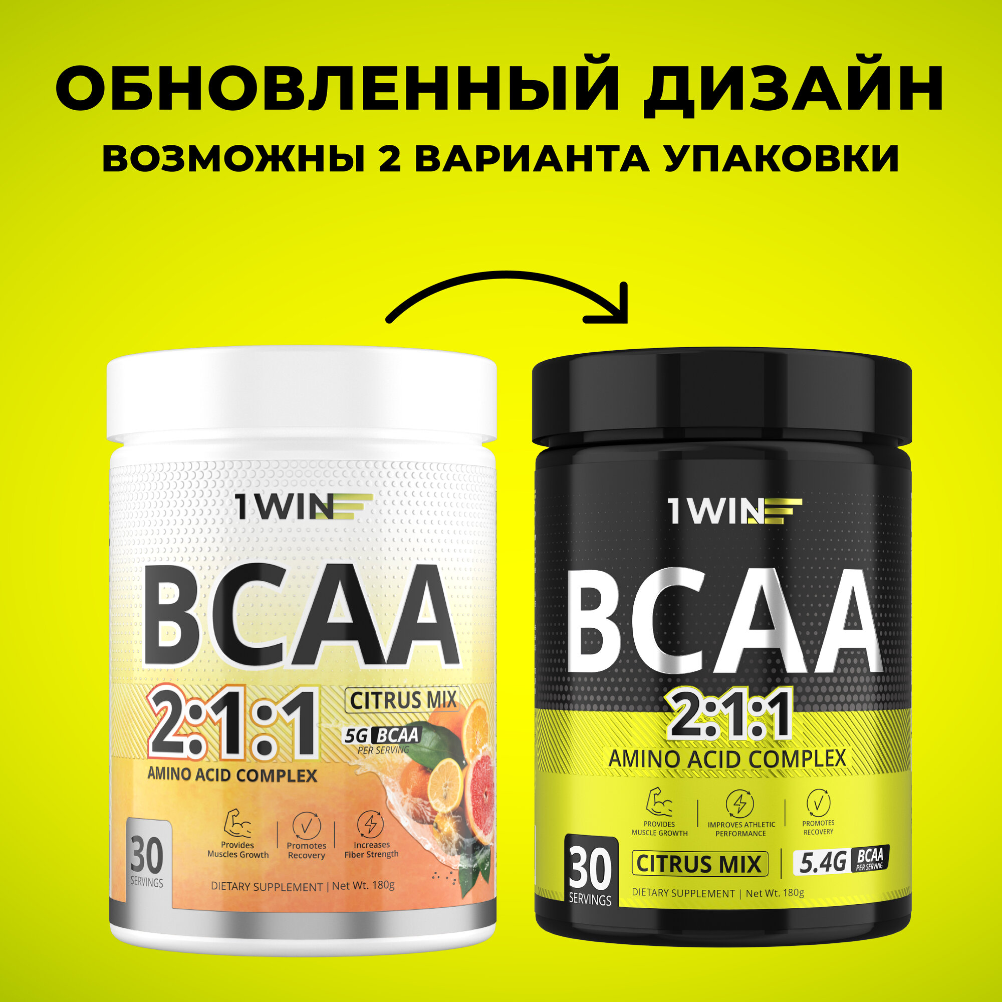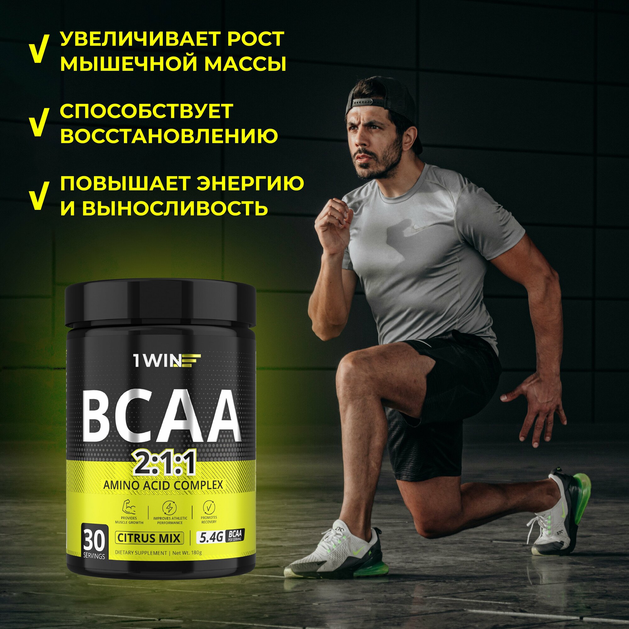 1WIN Аминокислоты BCAA 2:1:1 (БЦАА), Быстрорастворимые, со вкусом Лимон-лайм, 30 порций, 180грамм