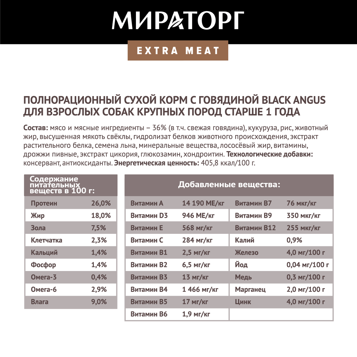 Сухой корм Мираторг Extra Meat для взрослых собак крупных пород старше 1 года, с говядиной Black Angus, 2.6 кг