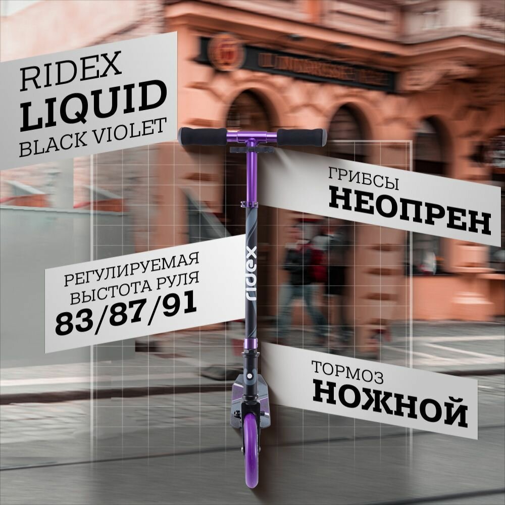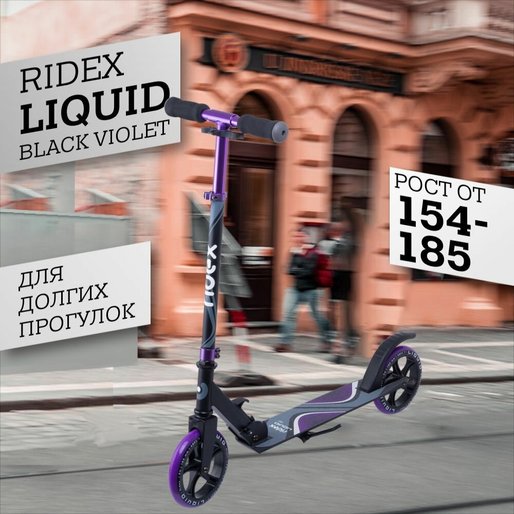 Лучшие цены. Liquid от RIDEX - новинка для взыскательных райдеров!\nКомфорт в использовании, надёжность и скорость, - в этой модели собрано всё, что так ценится в городских самокатах. За быстрый разгон отвечают шустрые подшипники ABEC-7, а PU колеса диаметром 180 мм промчат вас по улицам, сэкономив достаточно времени. Стильный дизайн двухколесного самоката для подростка или взрослого приятно радует глаз и привлекает к себе внимание окружающих. Магазины в вашем городе.