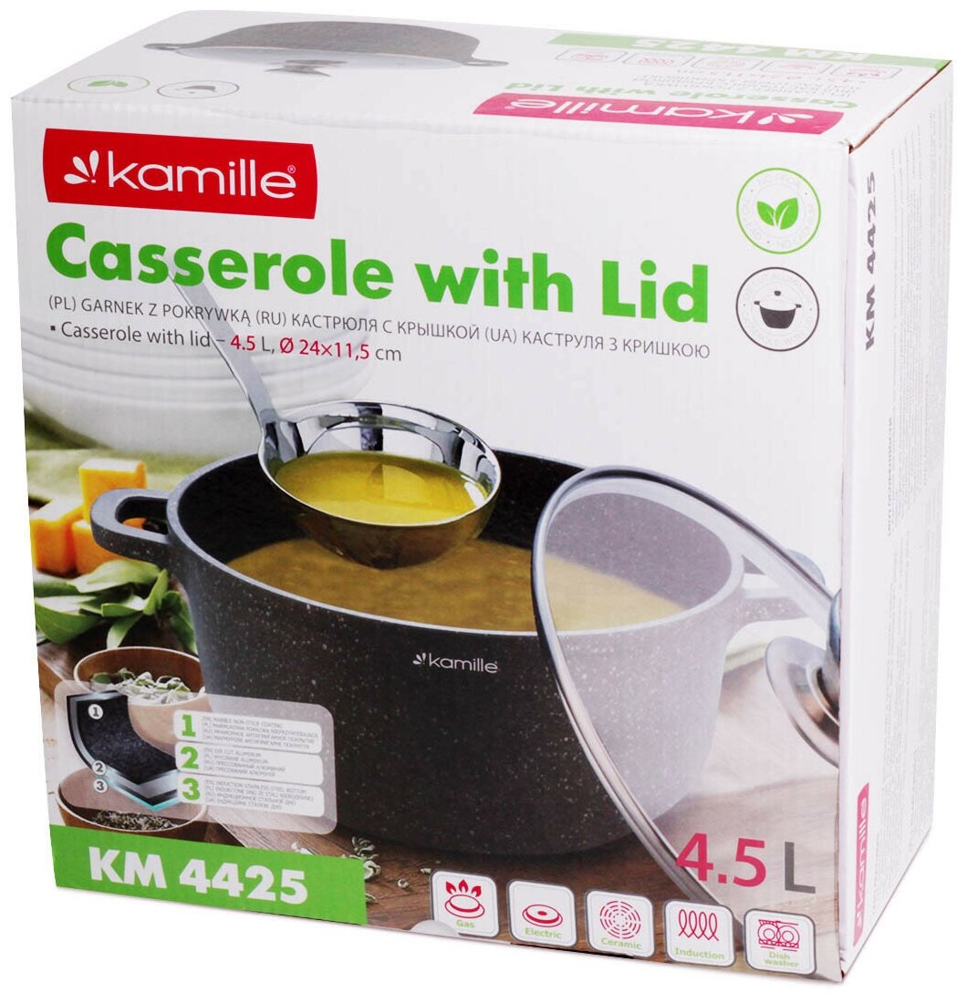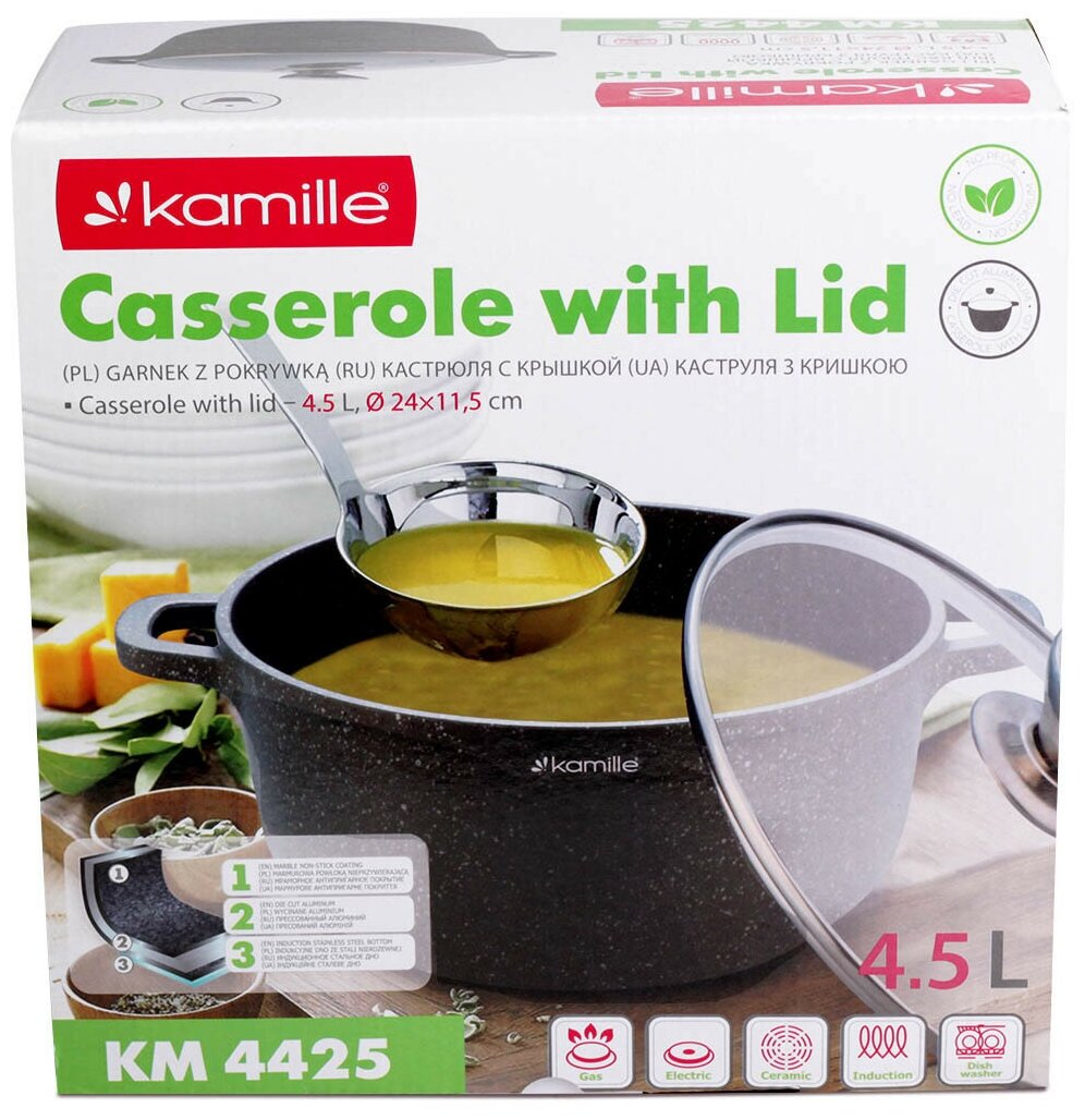 Кастрюля Кастрюля 4,5 л. из литого алюминия Kamille КМ-4425 (24х11,5 см.) с покрытием серый мрамор (4,5 л. / серый)