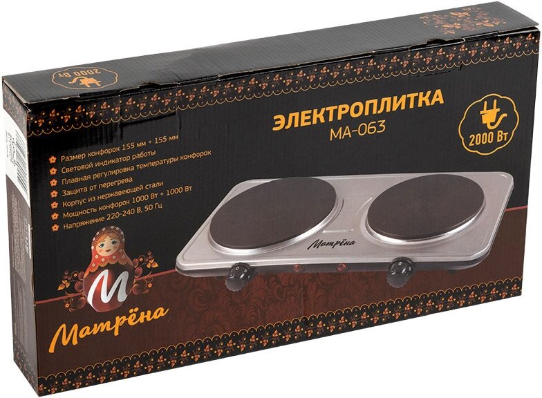 Плитка электрическая матрёна МА-063, 2000 Вт, 2 конфорки, коричневая